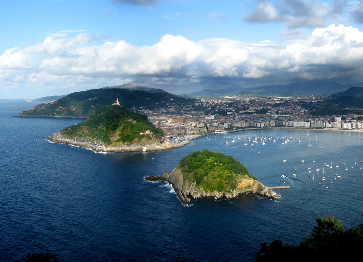 Description: A small island in the middle of a body of water with a city in the background and boats in the water.