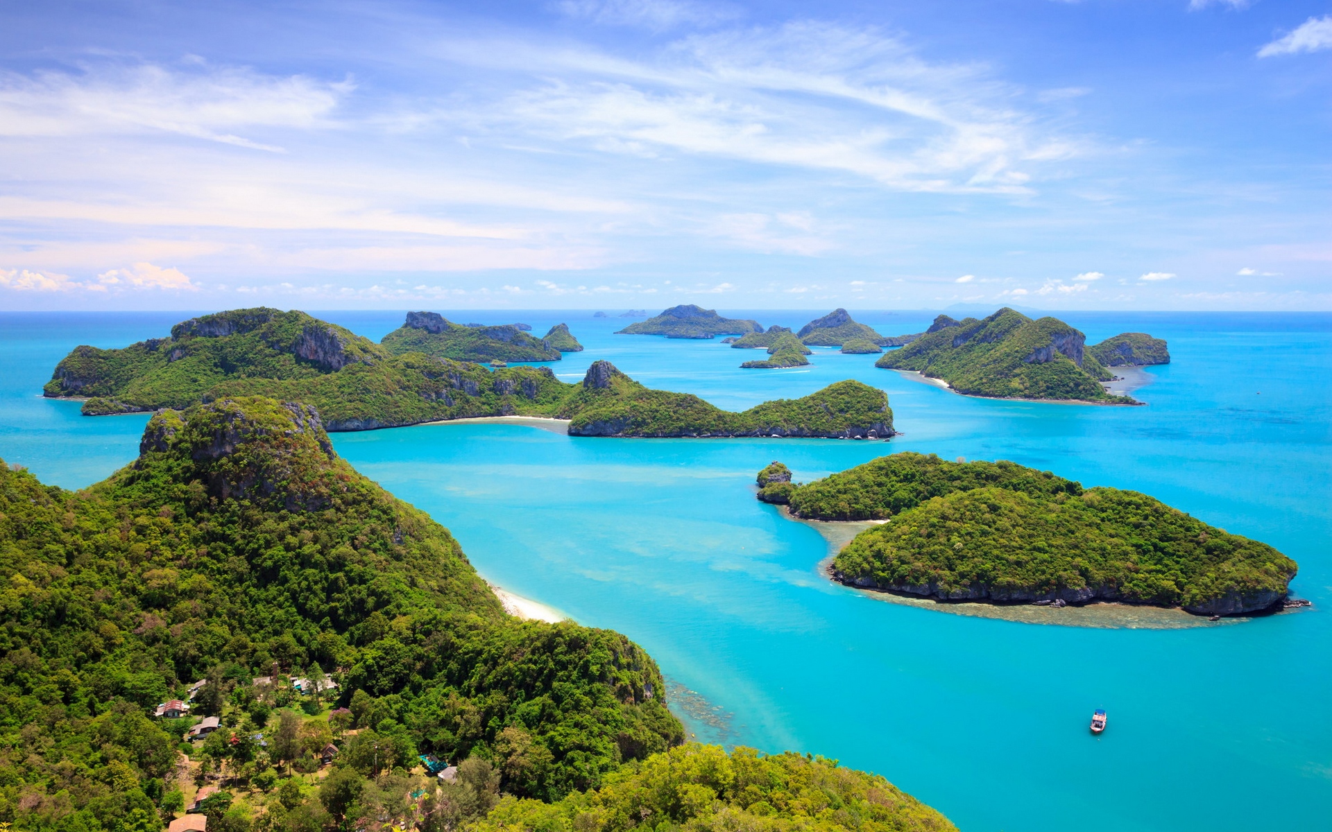 Description: A group of small islands in the middle of a body of water with a boat in the middle of the water.