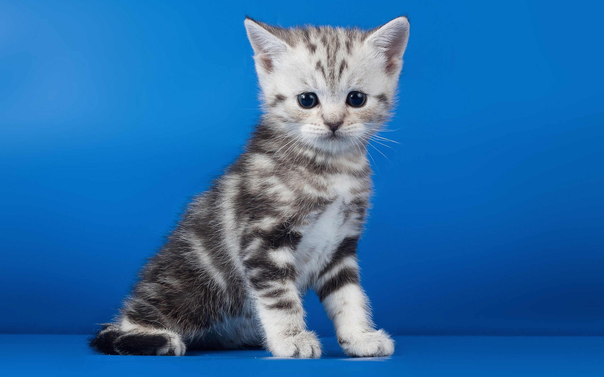 Description: A small kitten sitting on a blue background looking at the camera with a sad look on its face and eyes.