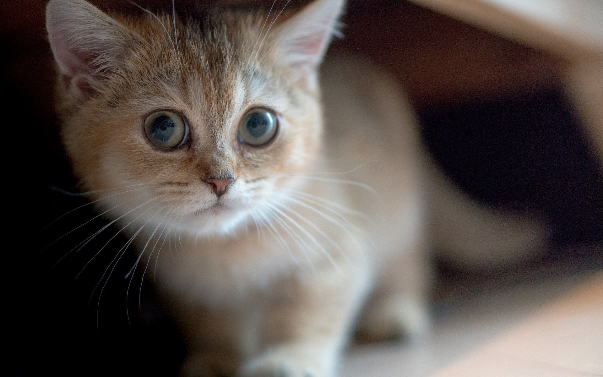 Description: A small kitten with blue eyes is looking at the camera while standing on the floor in front of a chair.