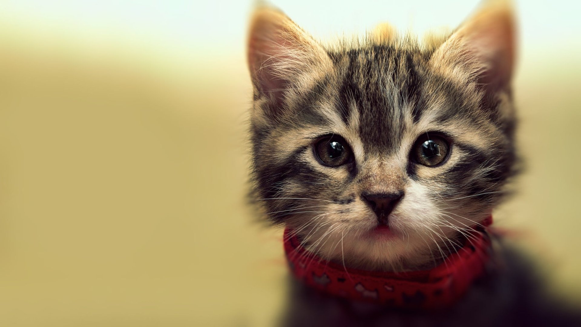 Description: A small kitten with a red collar looking at the camera with a serious look on its face and eyes.