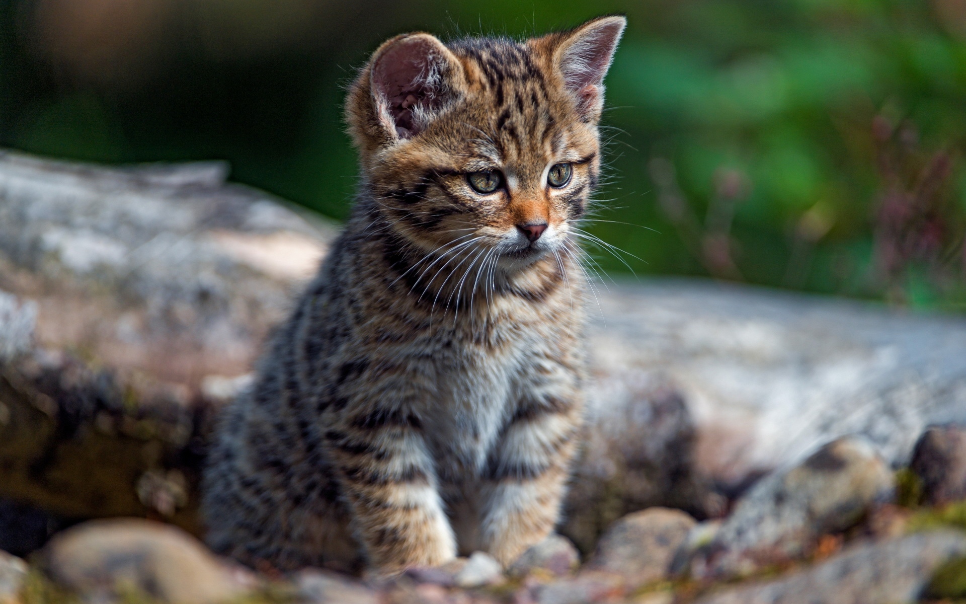 Description: A small kitten sitting on top of a rock next to a tree trunk and grass and rocks in the background.