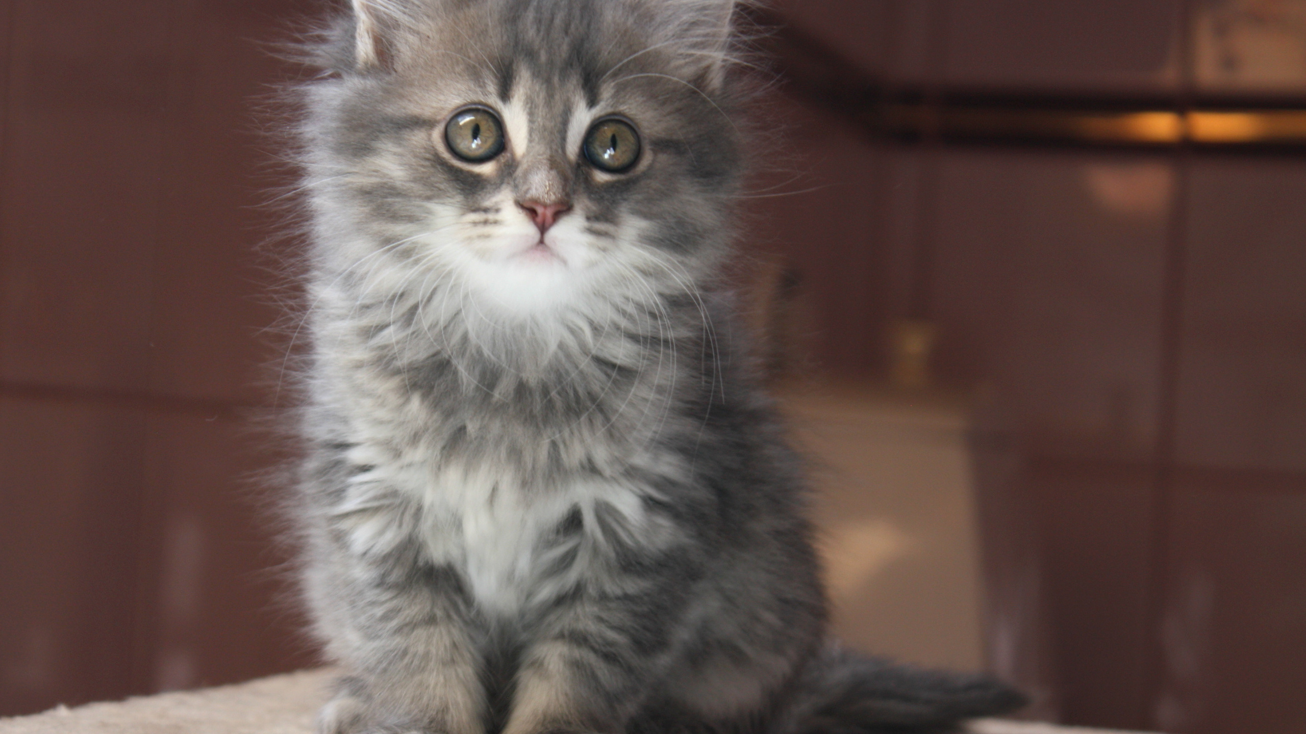 Description: A small kitten sitting on top of a table next to a wall and a door with a light on.