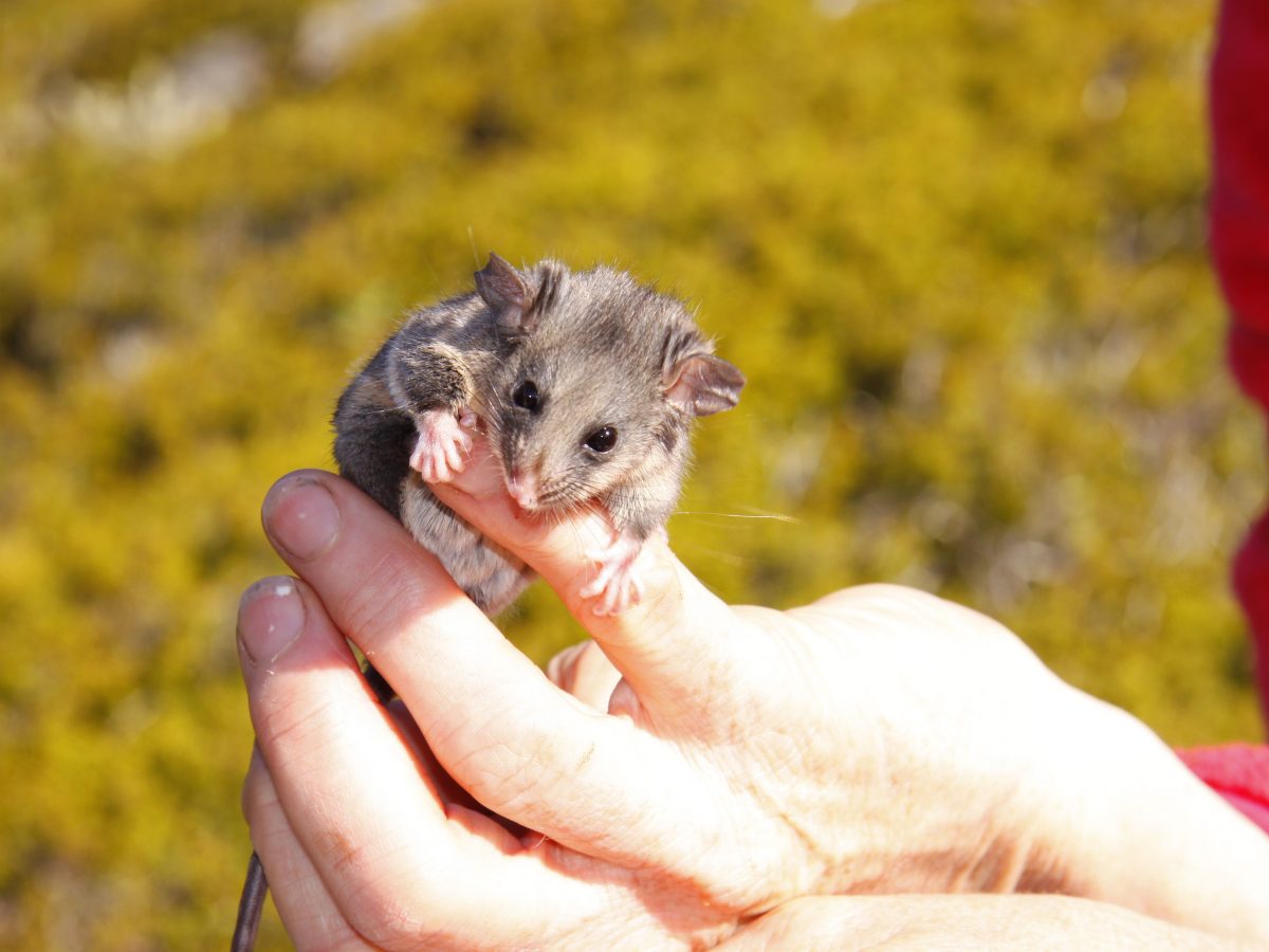 Description: A small mouse is being held in someone's hand with a red shirt on it's arm.