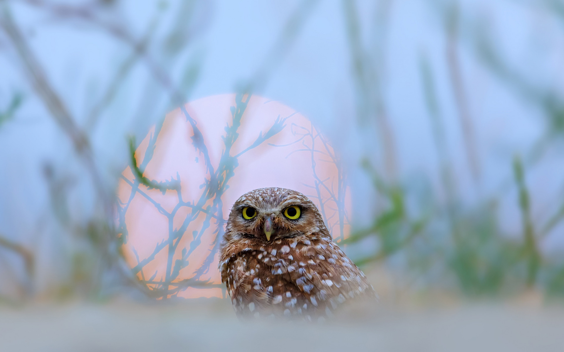 Description: A small owl is sitting in the grass near a large egg in the background with a pink light behind it.