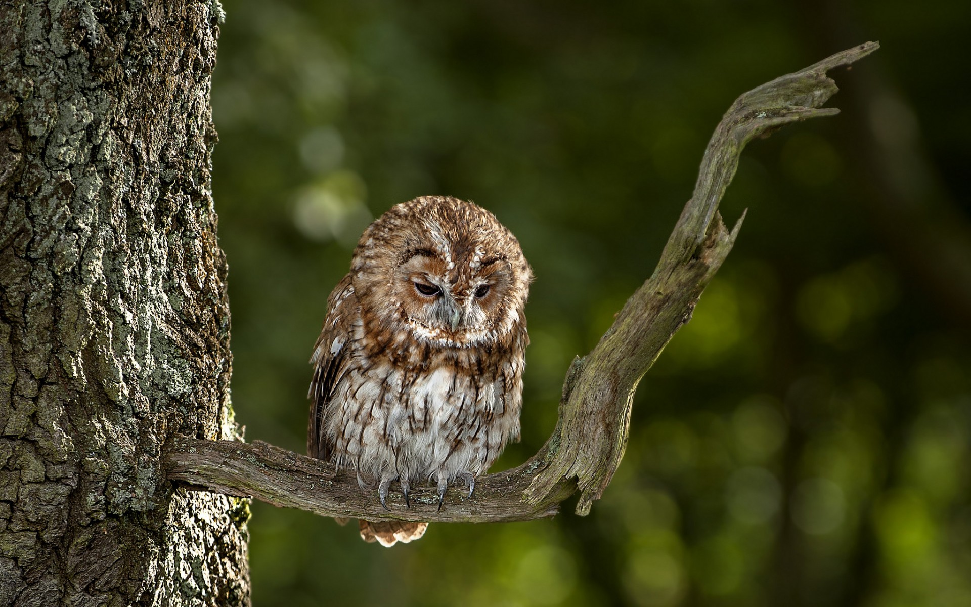 Description: A small owl sitting on a tree branch in a forest setting with green trees in the background and a blurred background.