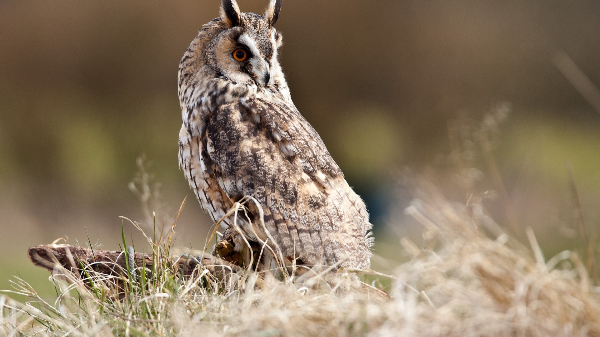 Description: A small owl is sitting in the grass and looking at the camera with a blurry background of grass and trees.