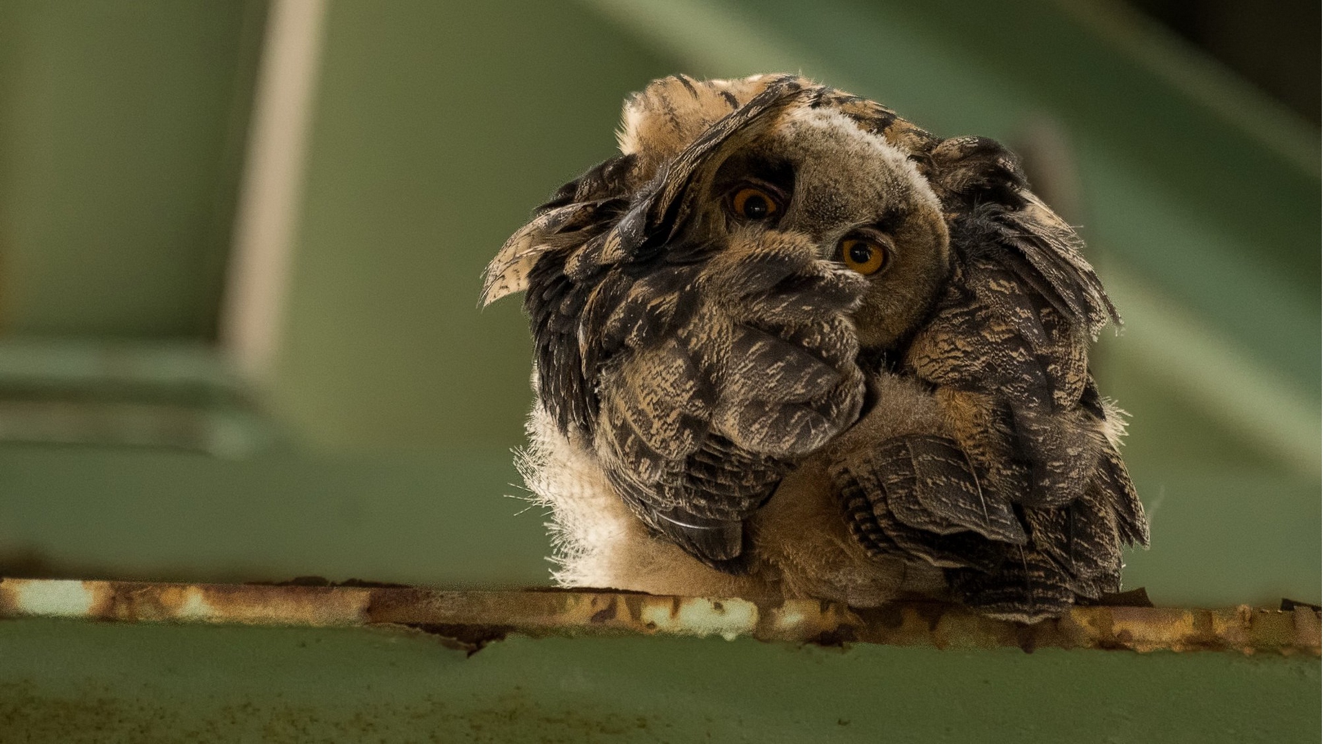 Description: A small owl sitting on top of a metal rail with its eyes open and a nose open.