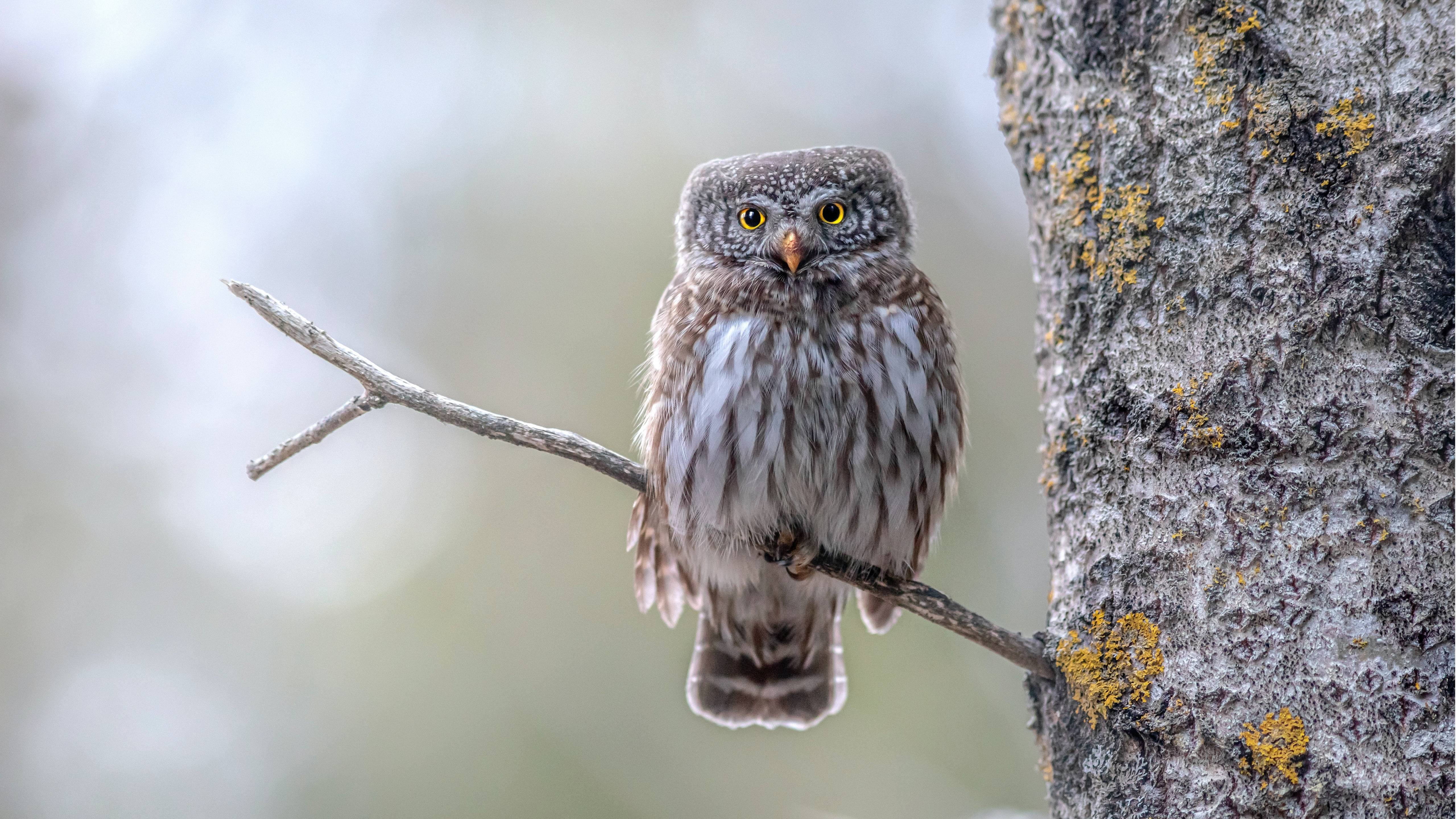 Description: A small owl perched on a tree branch in a forest with mossy trees in the background and a blurred background.