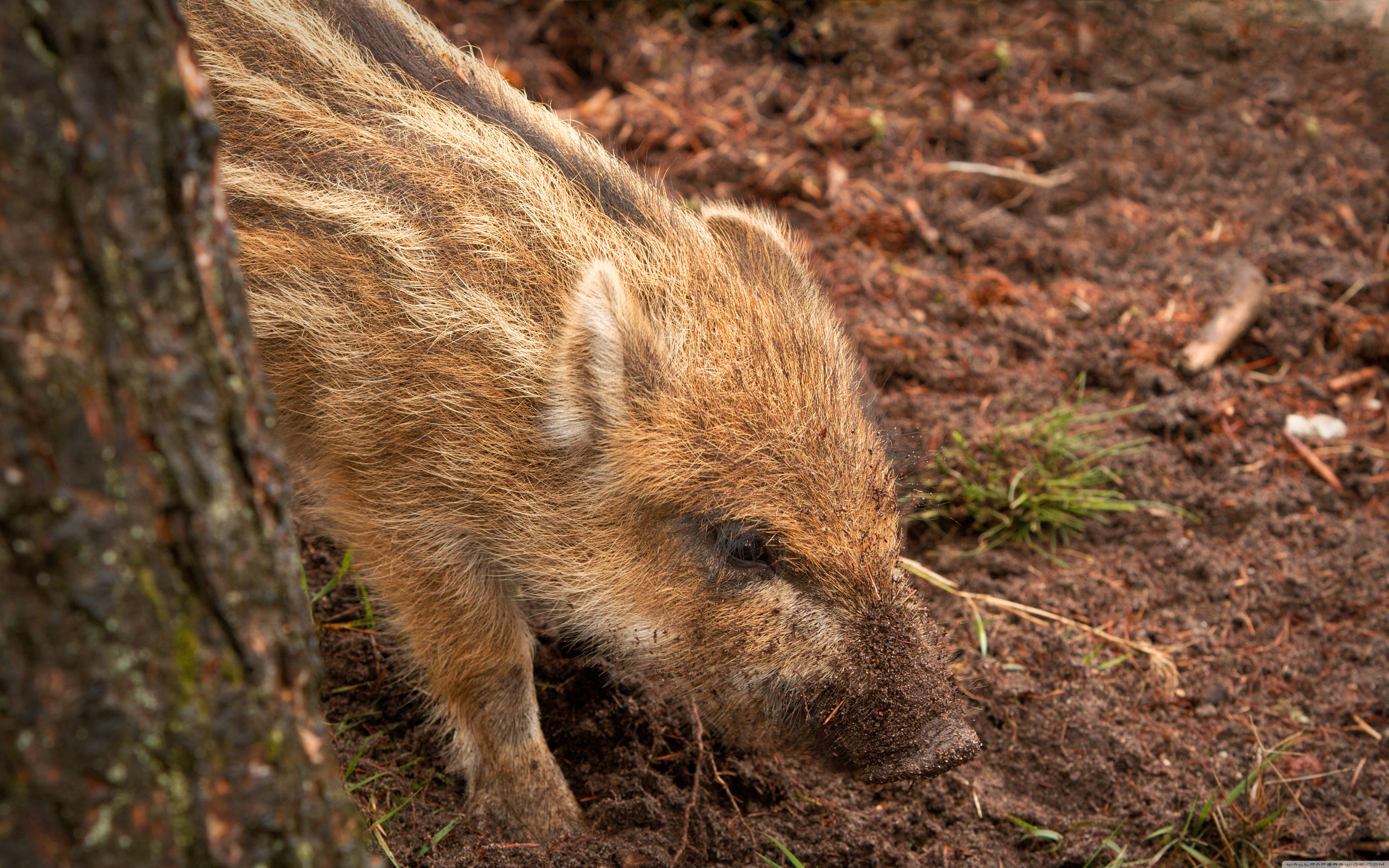 Description: A small pig is digging in the dirt near a tree trunk and a tree trunk with a stick in it.