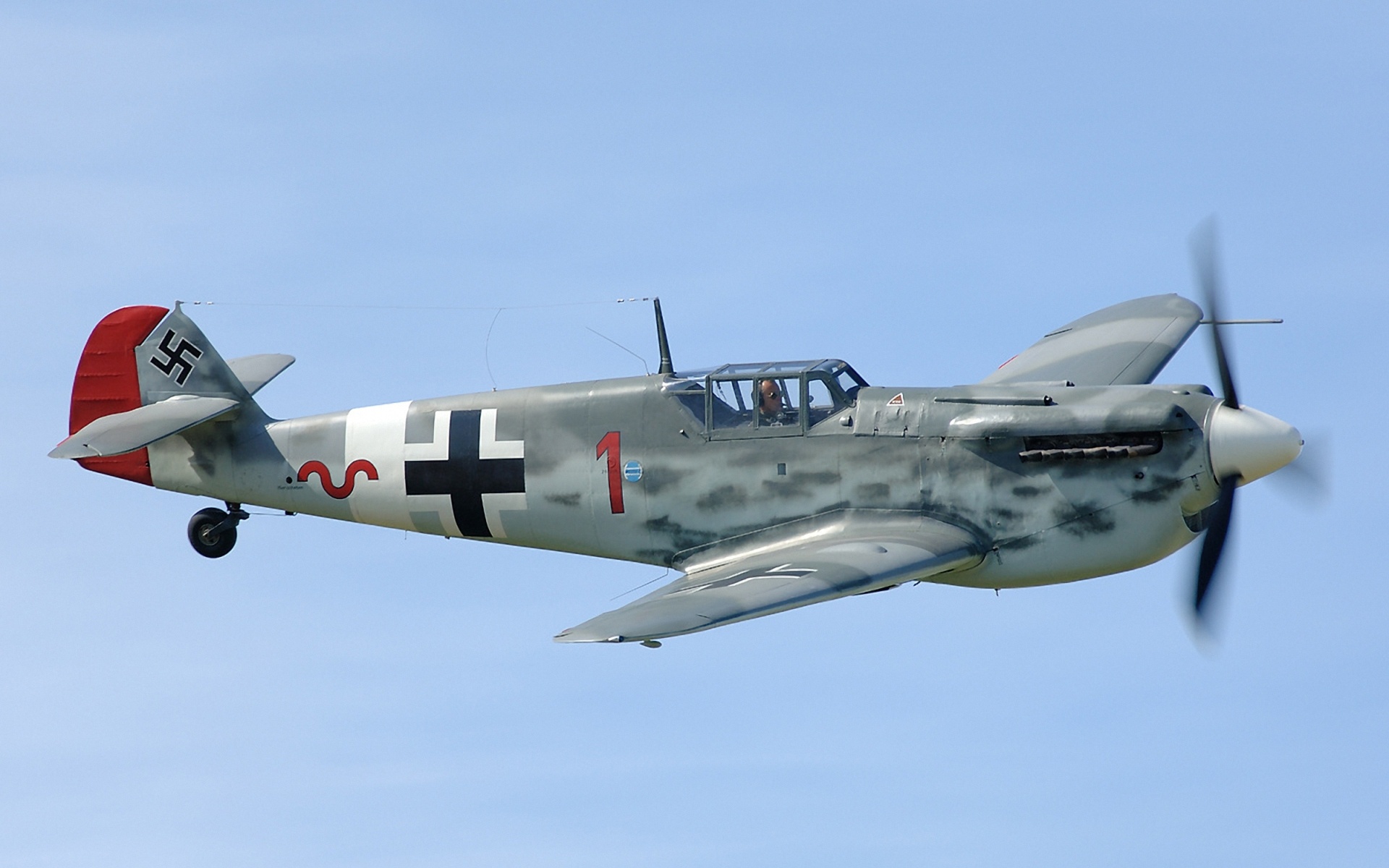 Description: A small plane flying through a blue sky with a propeller on it's side and a pilot in the cockpit.