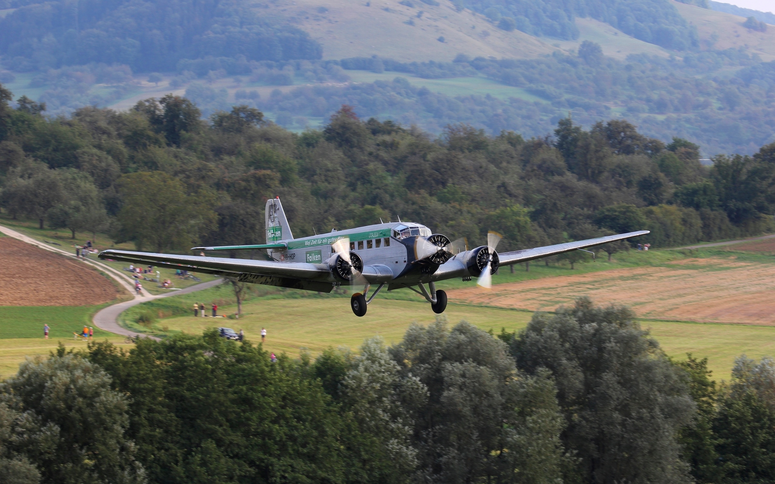 Description: A small plane flying low over a lush green field with trees in the background and a mountain in the distance.