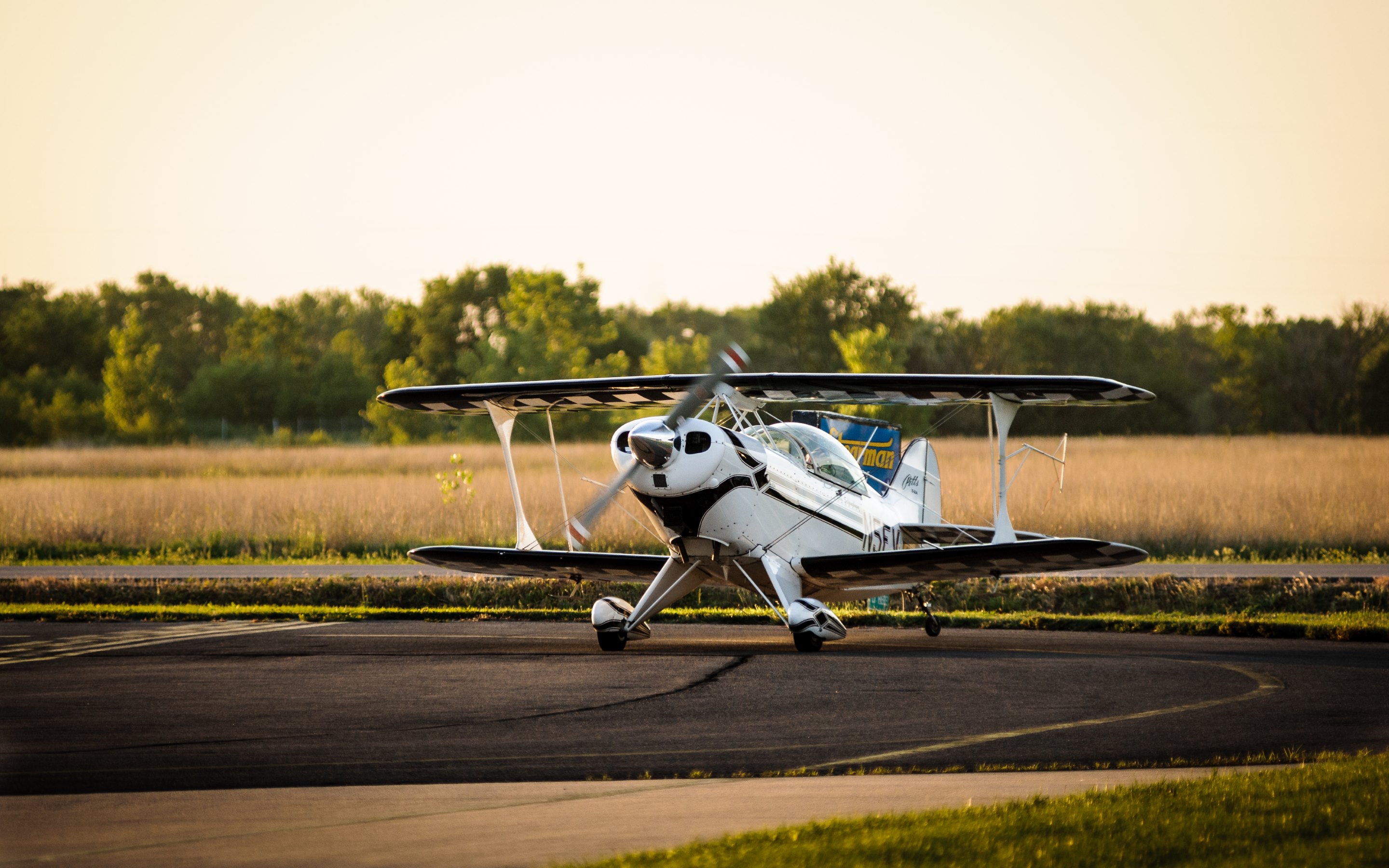 Description: A small plane is parked on the runway in a field of grass and trees in the background.