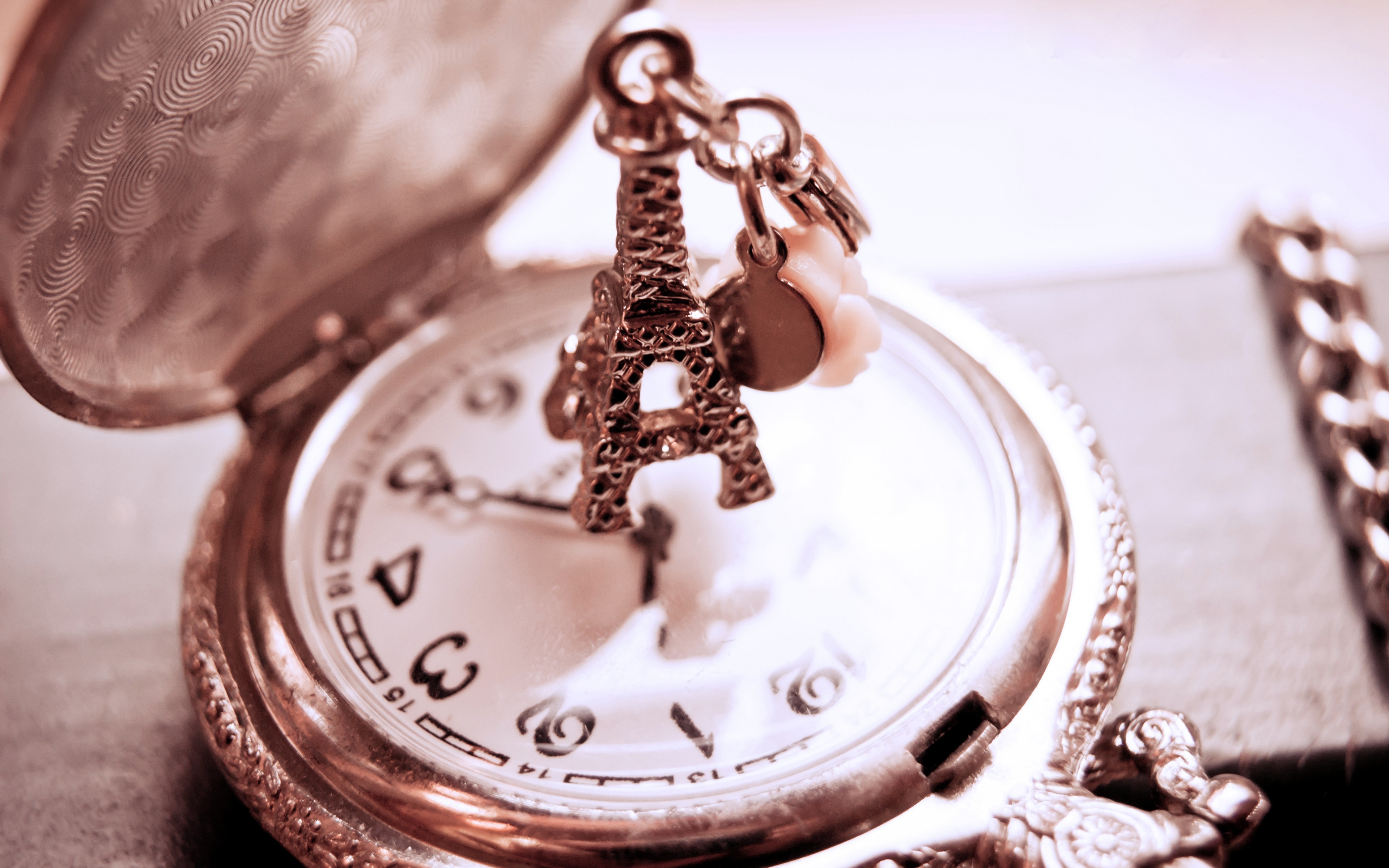 Description: A small pocket watch with a chain around it and a small eiffel tower on the front of it.