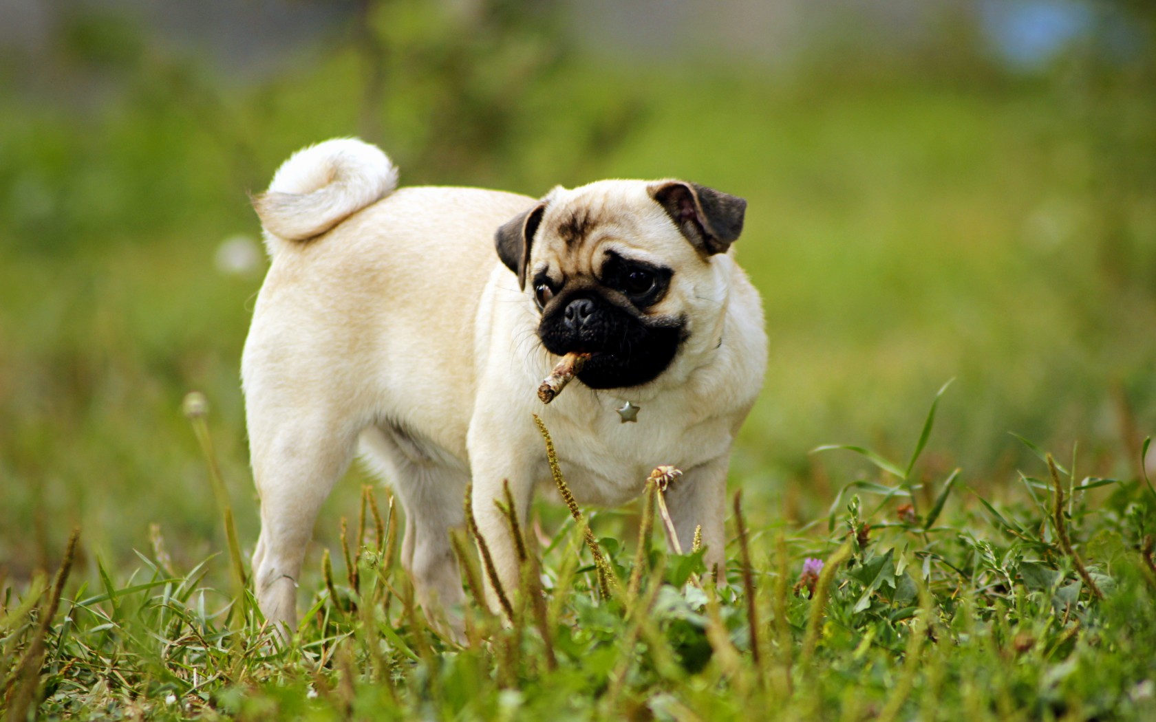 Description: A small pug dog standing in a field of grass with a stick in its mouth and a stick in its mouth.