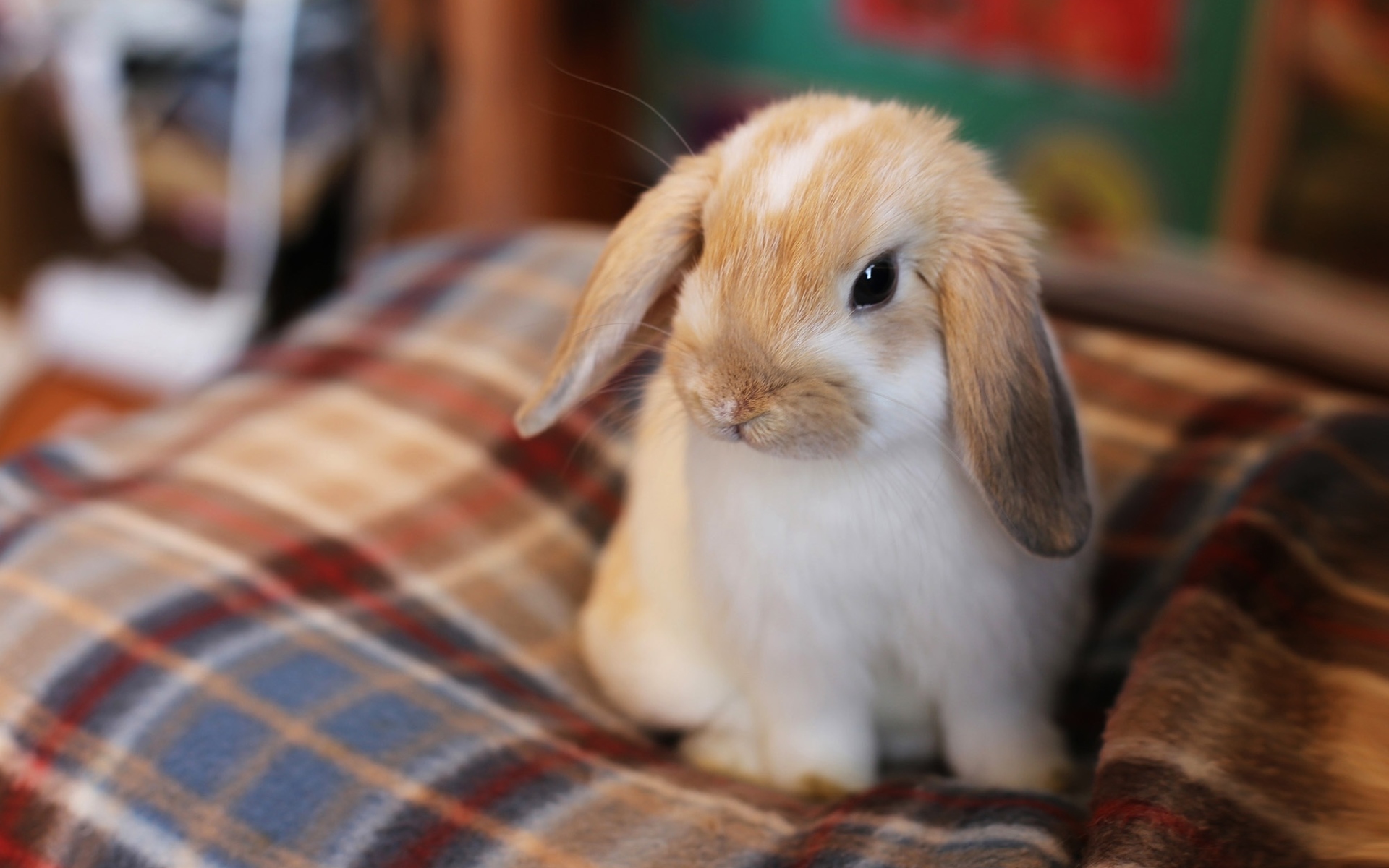 Description: A small rabbit sitting on a blanket on a table top with a book in the background and a glass of water in the foreground.