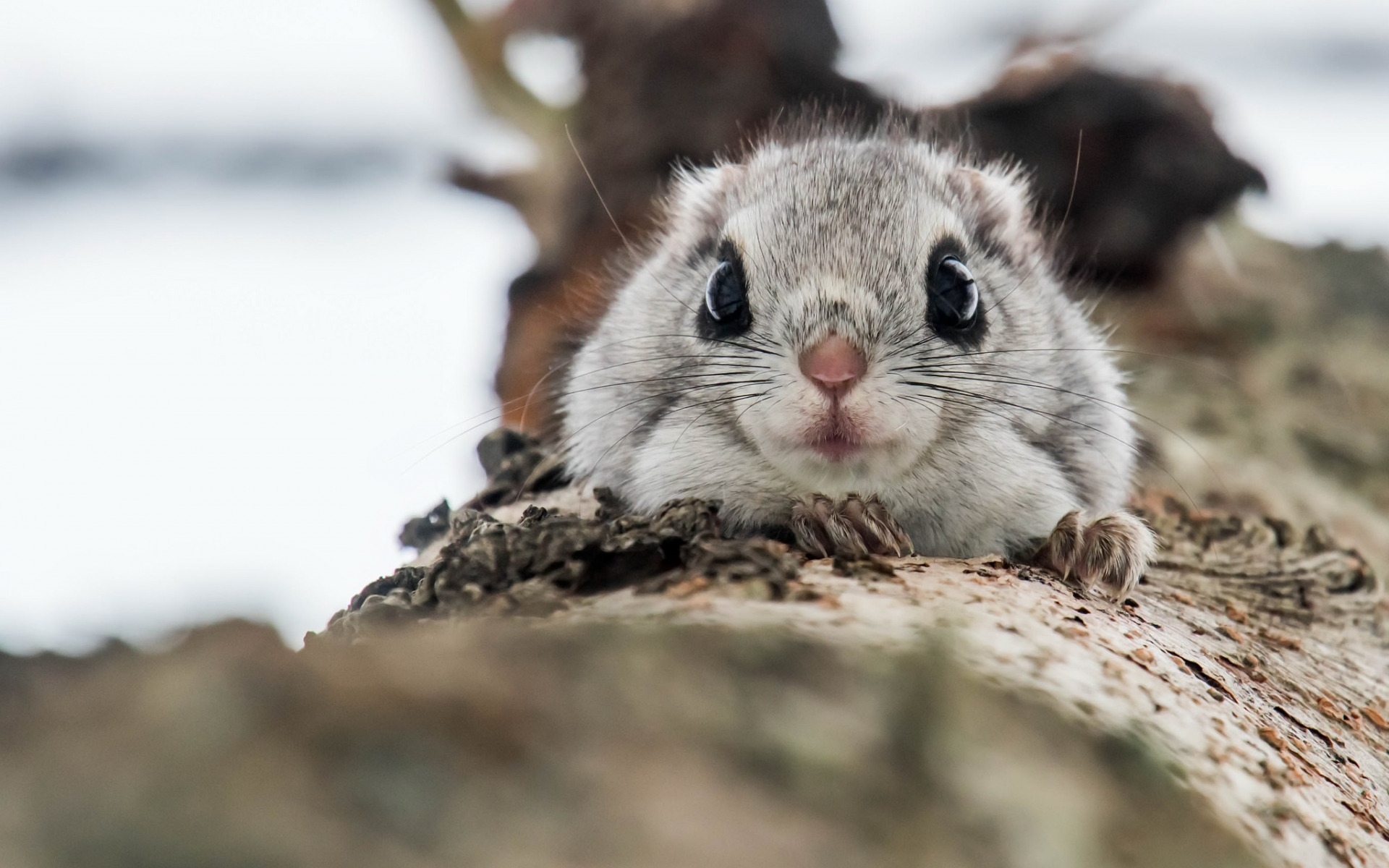 Description: A small rodent sitting on top of a tree trunk looking at the camera with a surprised look on its face.