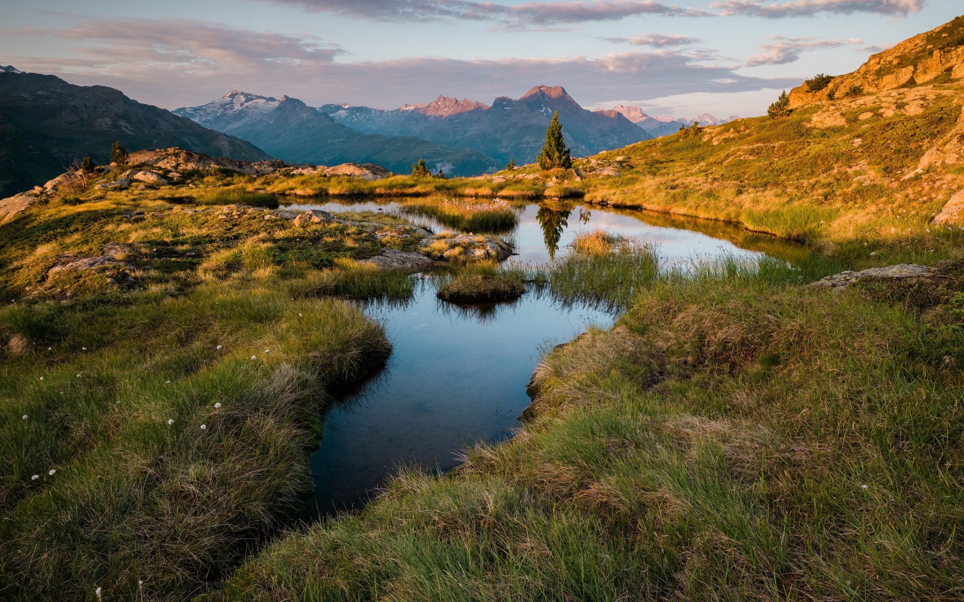 Description: A small stream running through a lush green hillside covered in grass and mountains in the distance.