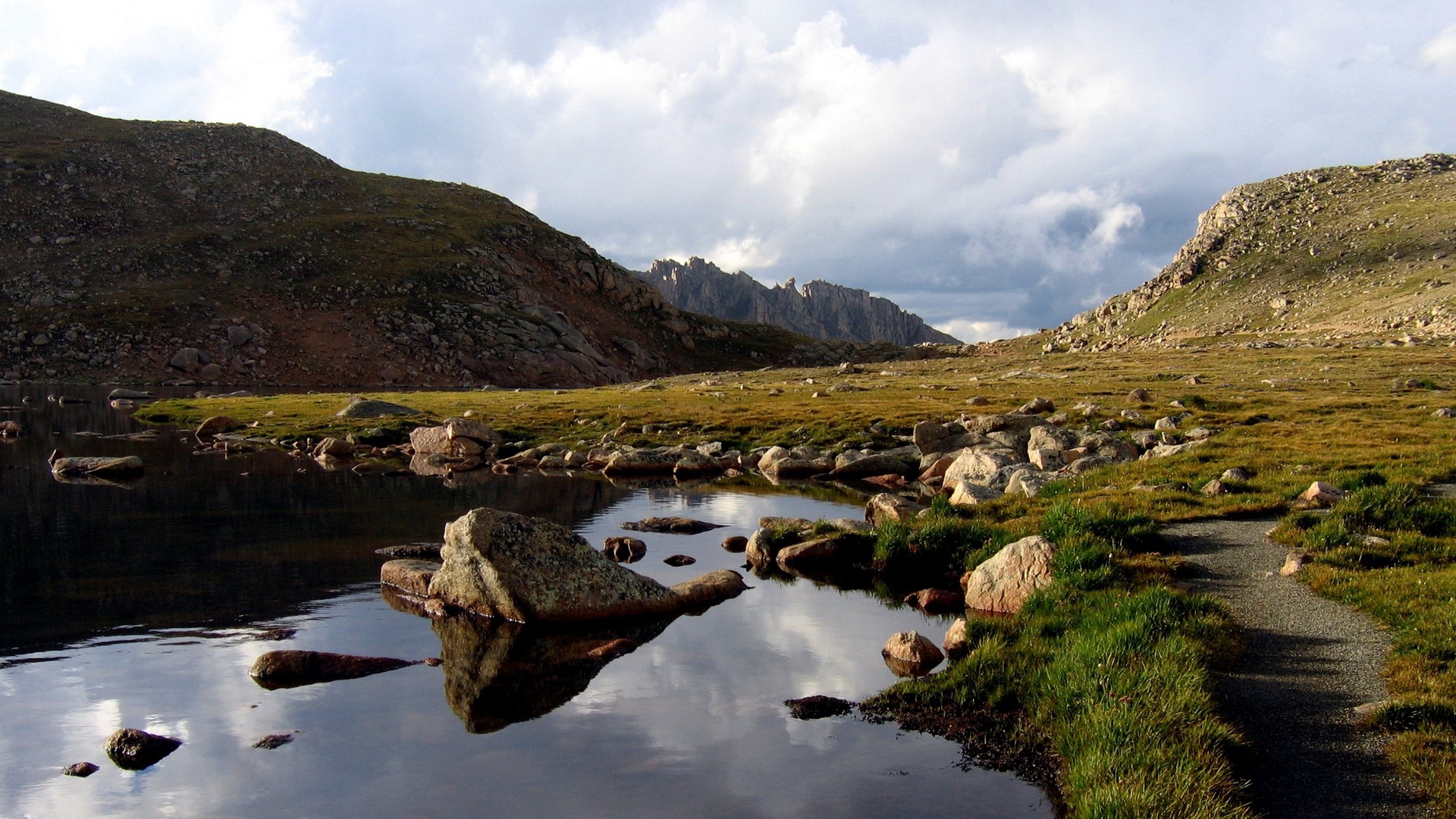 Description: A small stream running through a lush green valley filled with rocks and grass next to a mountain range with a cloudy sky.