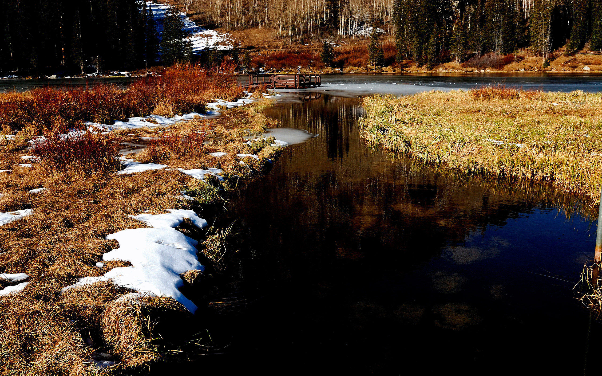 Description: A small stream running through a snow covered field next to a forest filled with trees and grass covered in snow.