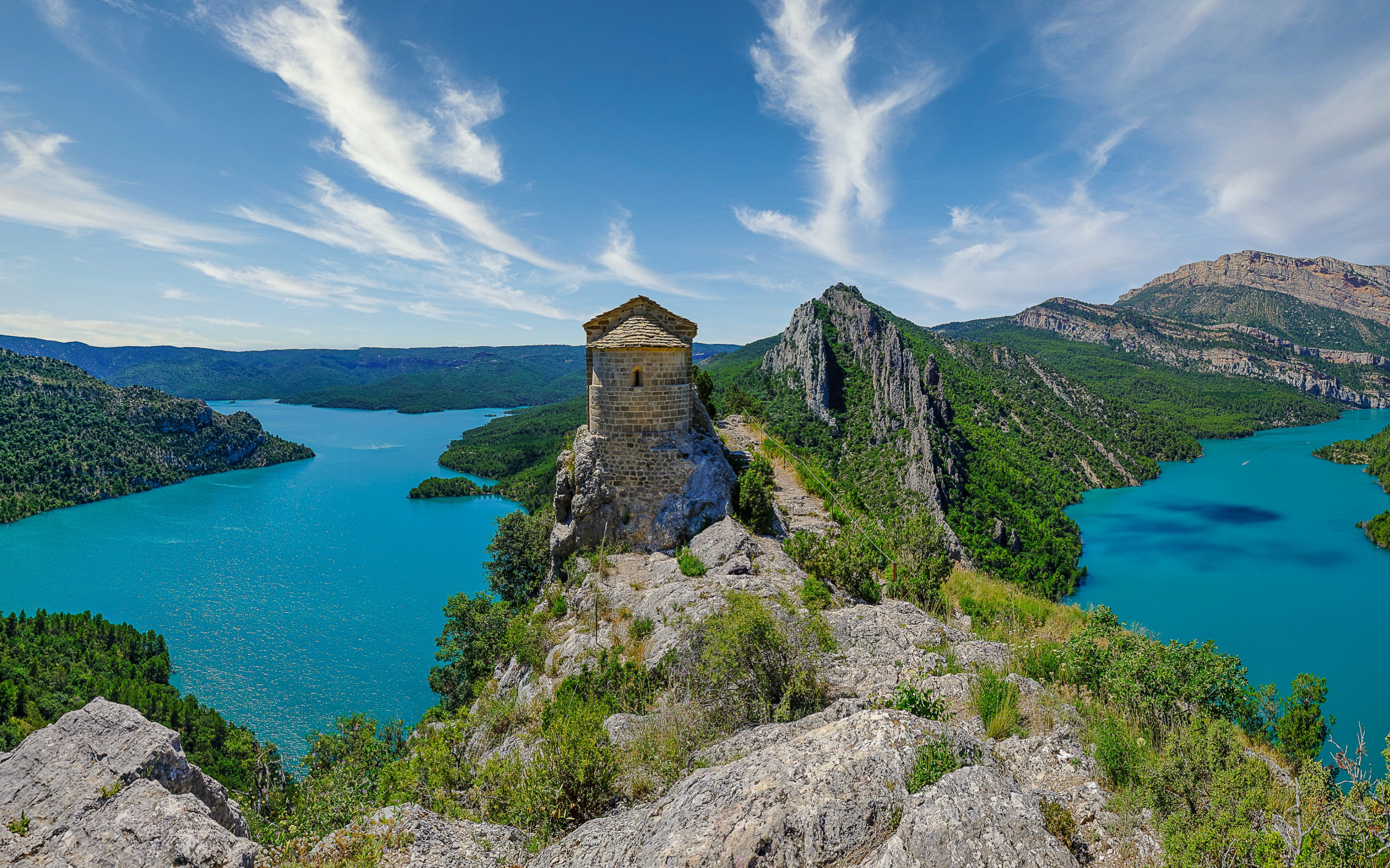 Description: A small tower on a mountain overlooking a lake and mountains with a blue sky in the background and a few clouds in the sky.