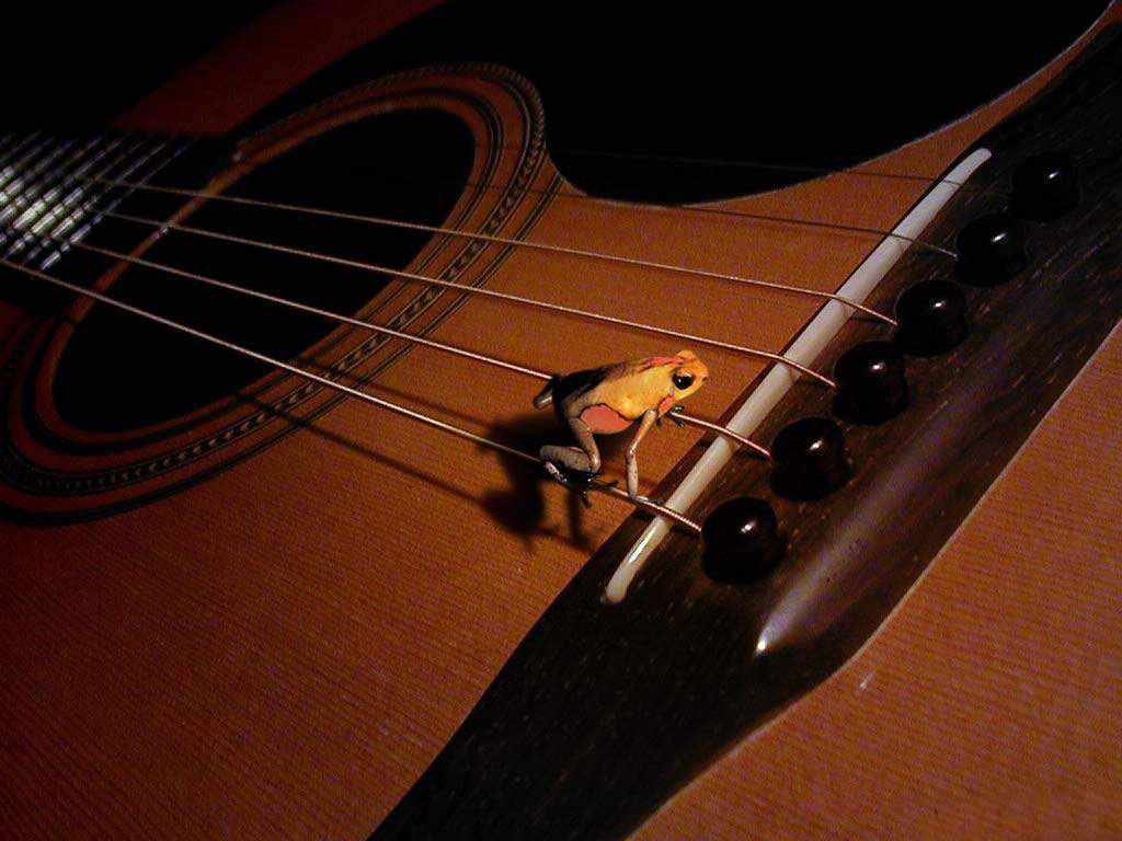 Description: A small toy is sitting on top of a guitar strings and strings.