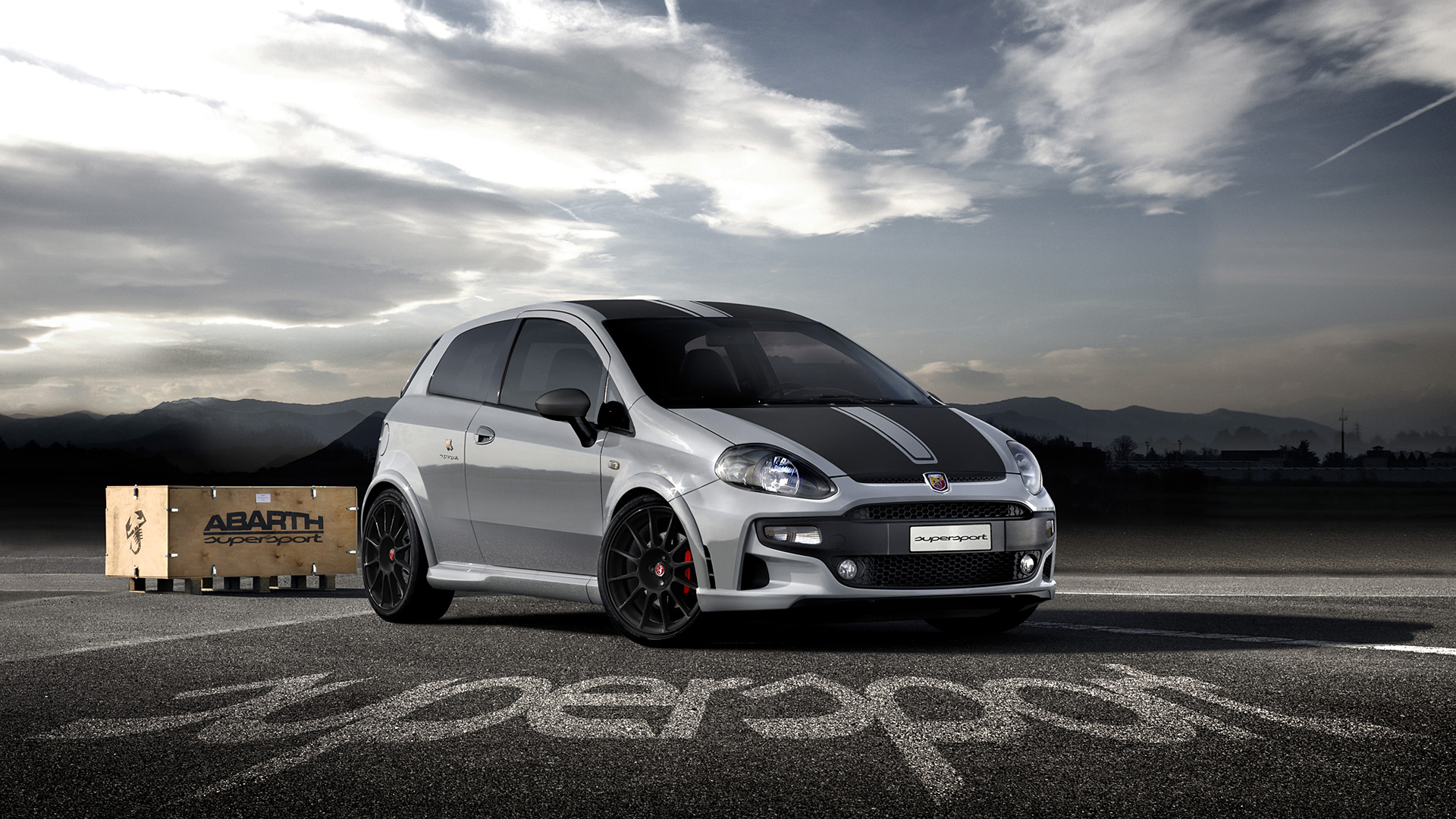 Description: A small white car parked in a parking lot with a box of pizza in front of it and a cloudy sky.