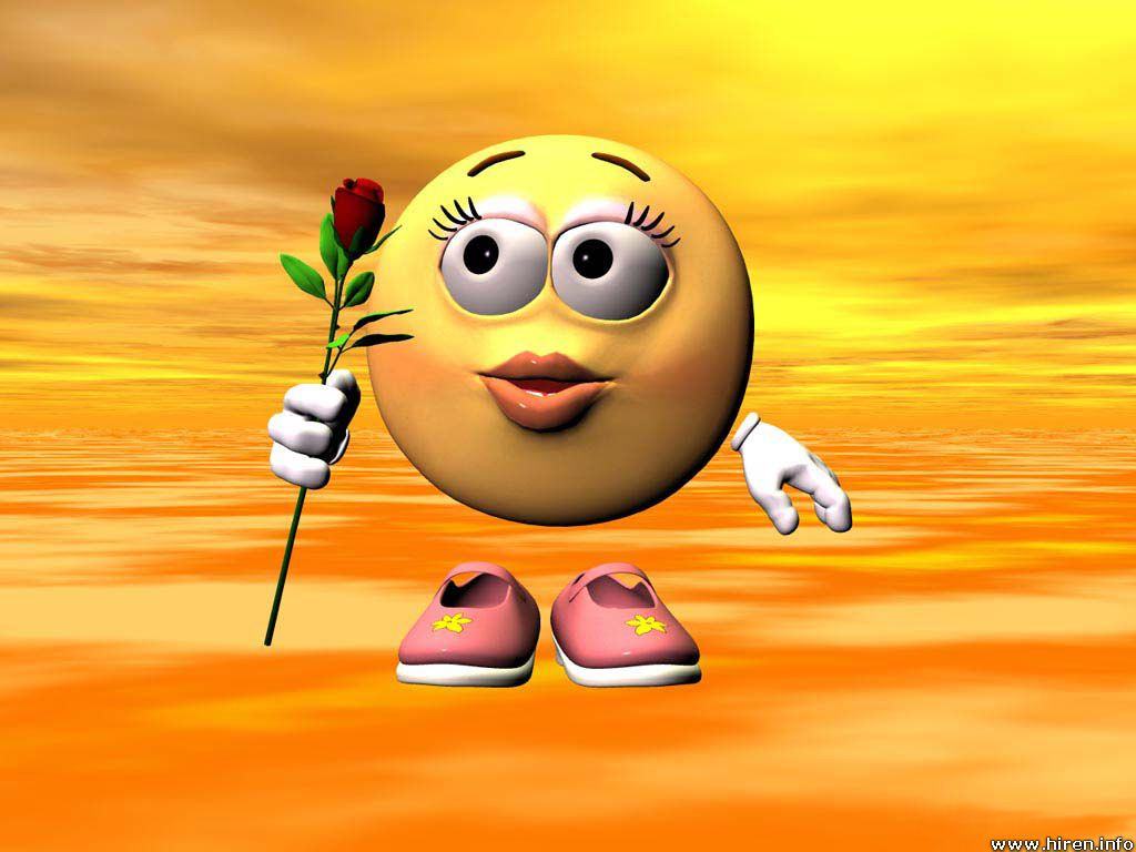 Description: A smiley face holding a rose in its hand and pointing to it with a finger on a yellow background.
