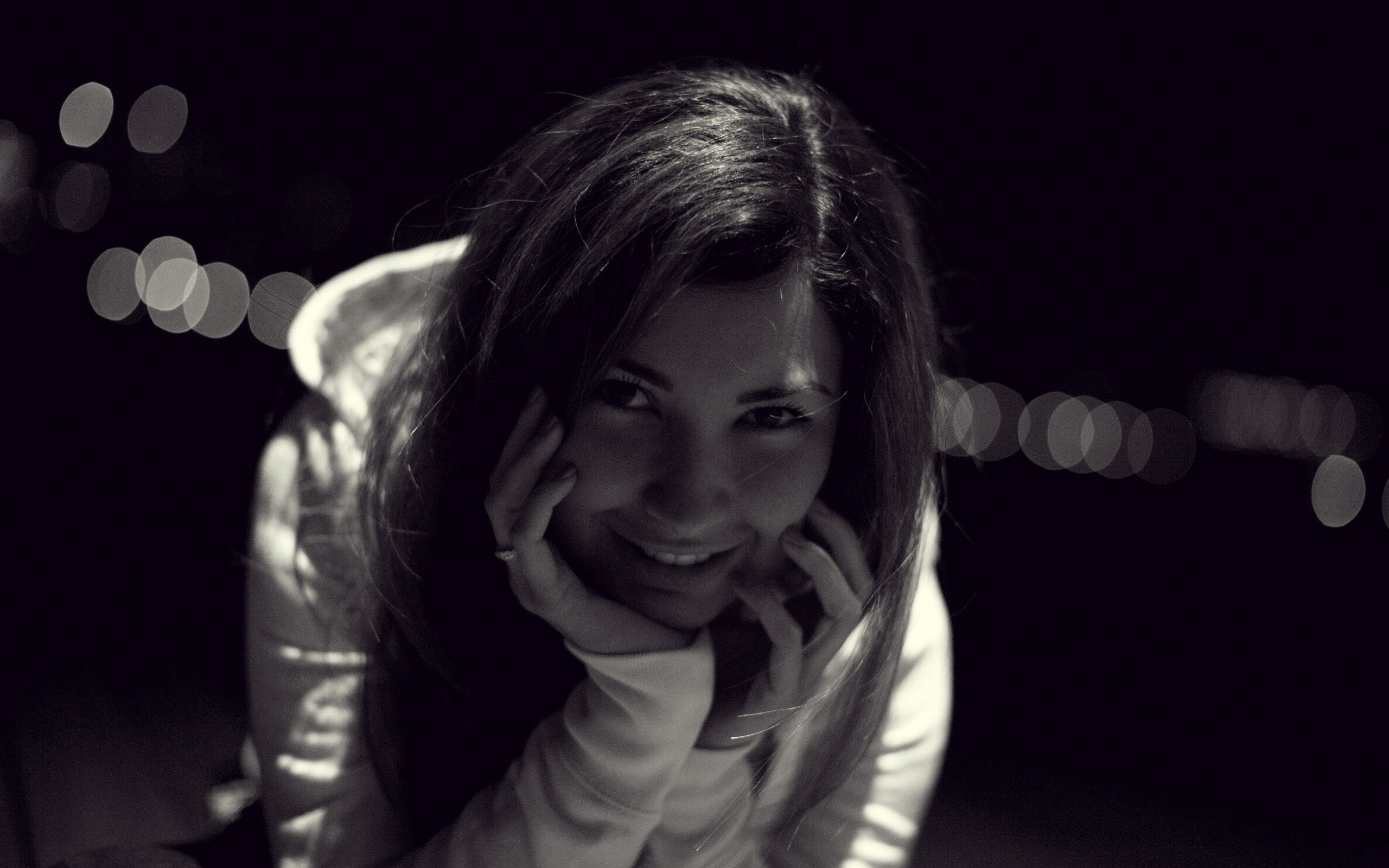 Description: A woman is smiling and posing for a picture with her hands on her face and her hands on her face.