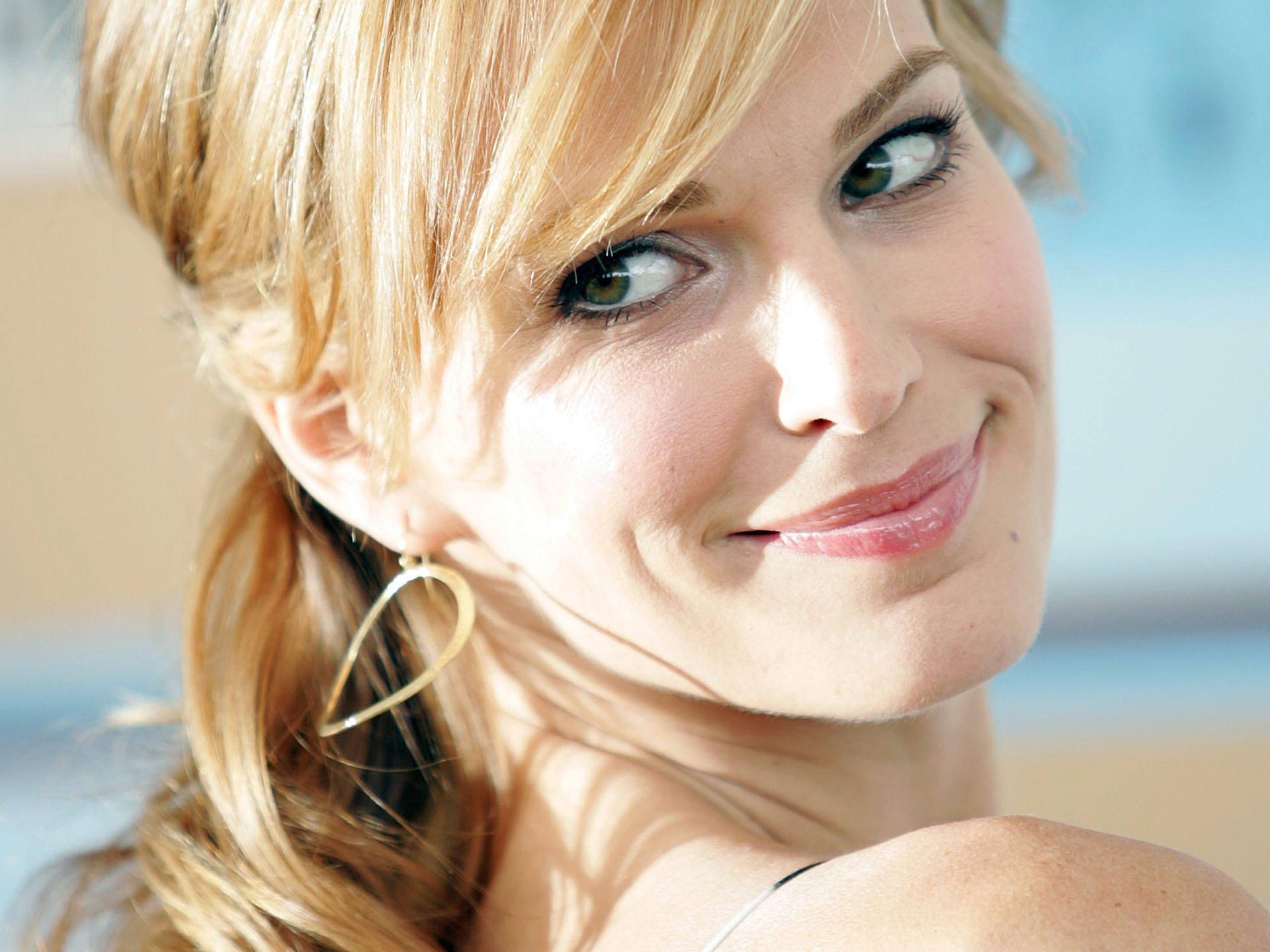 Description: A woman with a smile on her face and a cell phone in her hand and a blue background behind her.