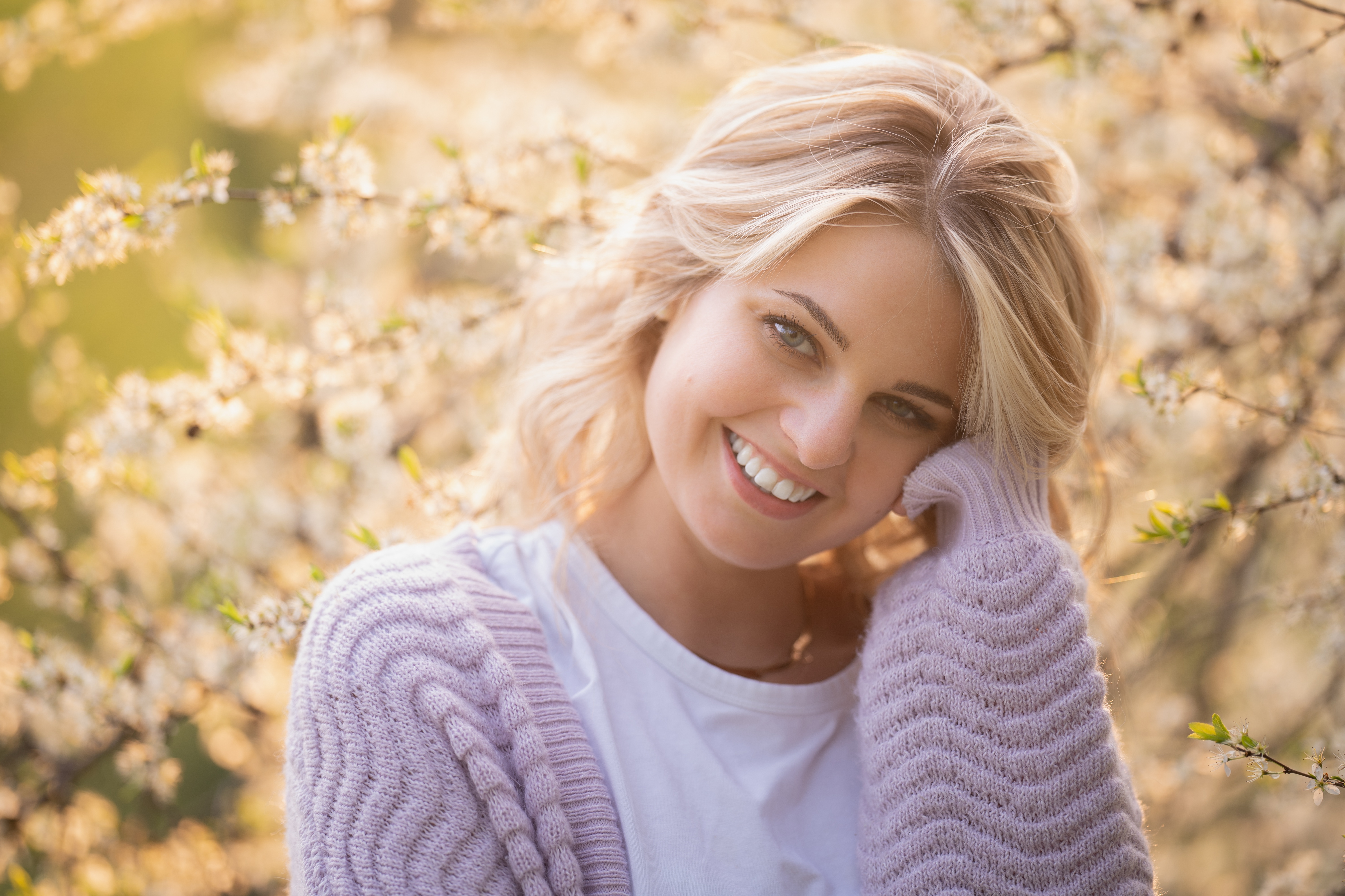 Description: A woman is smiling while holding her hand on her head and posing for a picture in front of a tree.