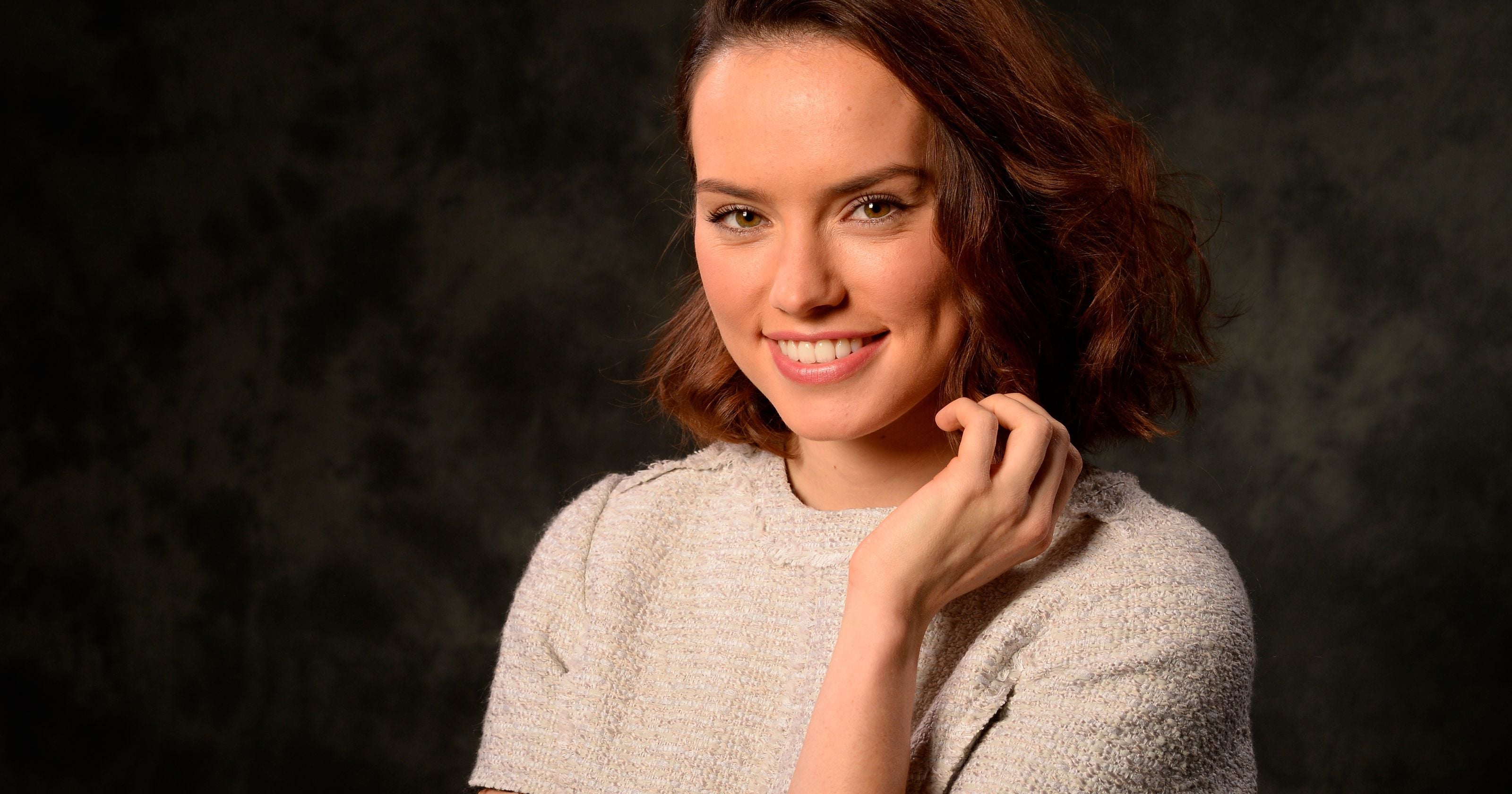 Description: A woman with a smile on her face posing for a picture with her hand on her chin and her hand on her shoulder.