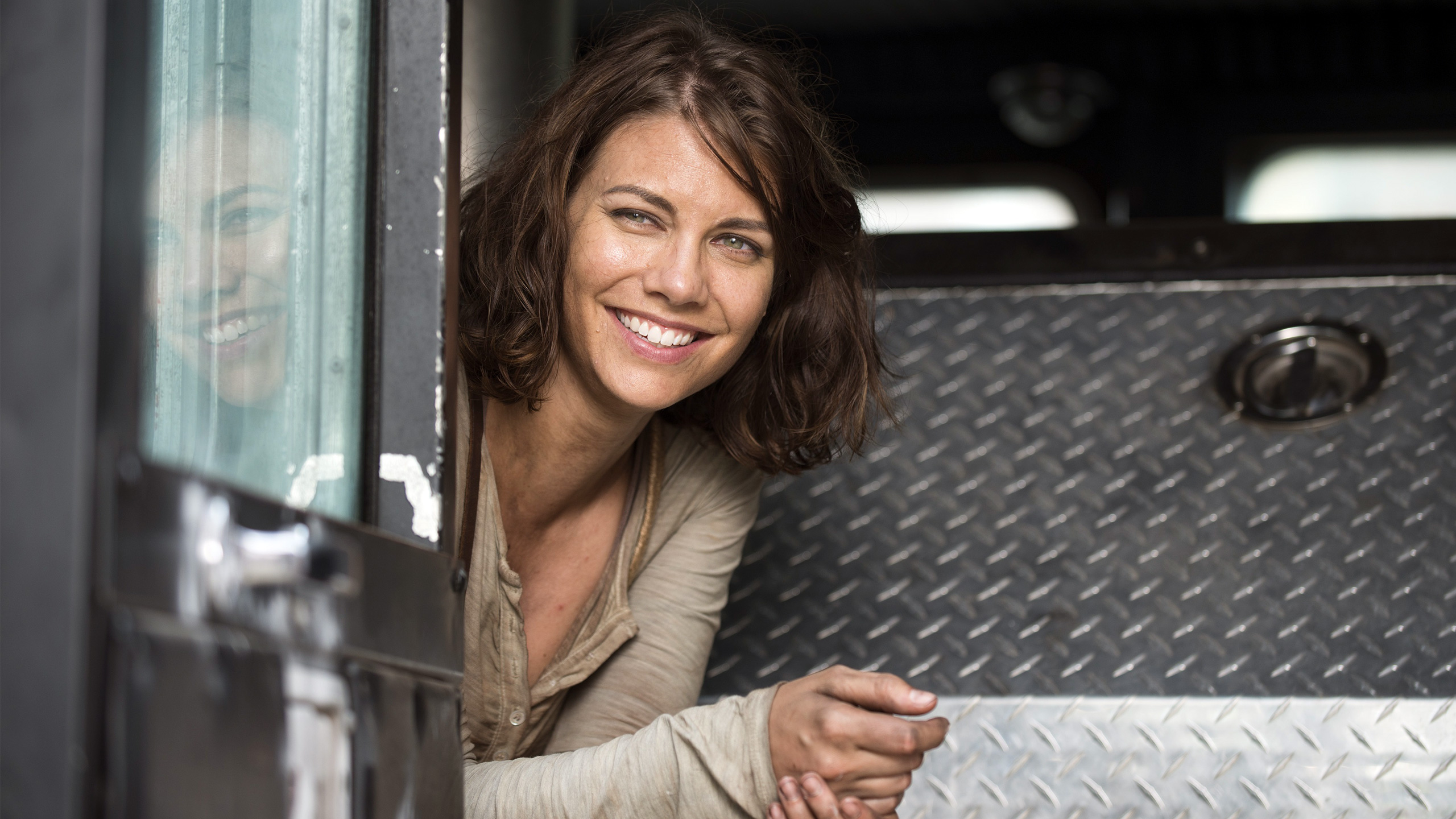 Description: A woman is smiling and leaning out of a truck door with her hand on the door handle of the truck.