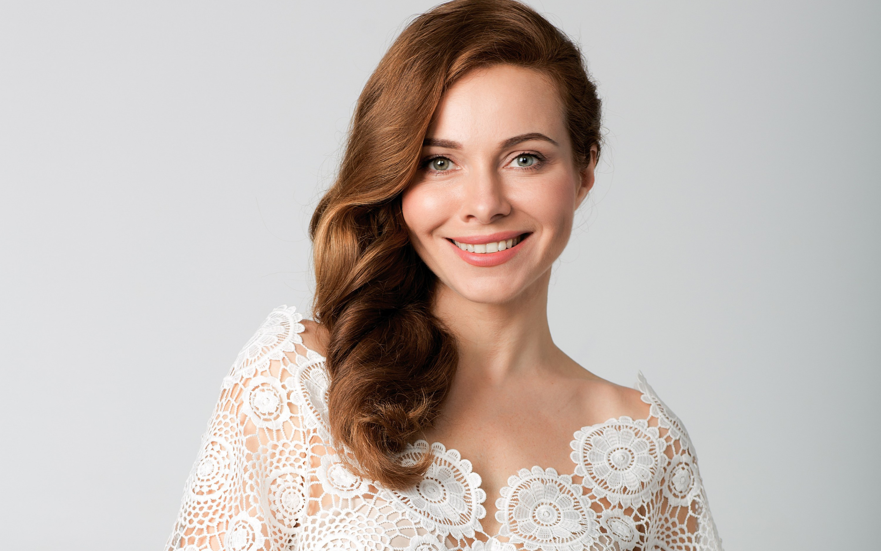 Description: A woman with a smile on her face and a white shirt on her shoulders.