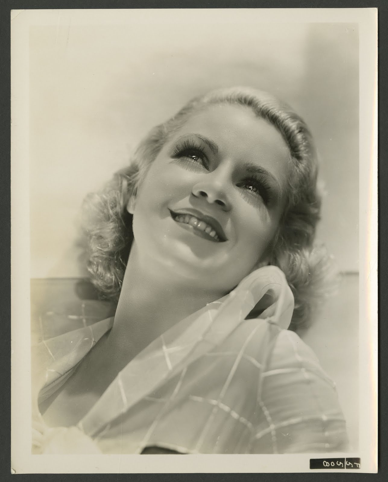 Description: A woman with a smile on her face and a white shirt on her chest and a black and white photo of her.
