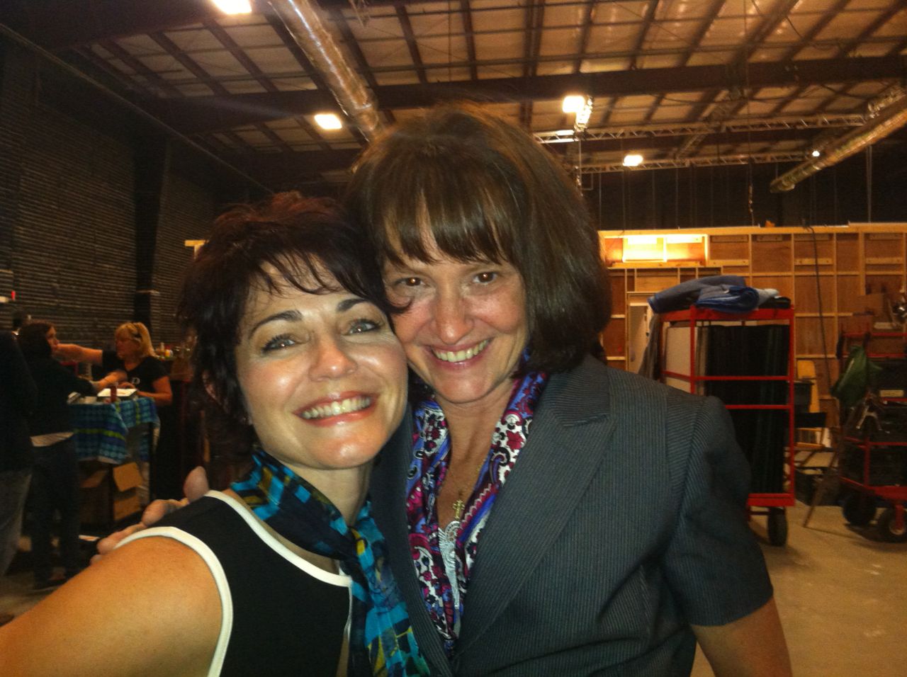 Description: Two women are smiling for the camera in a warehouse area with other people in the background and a table with food on it.