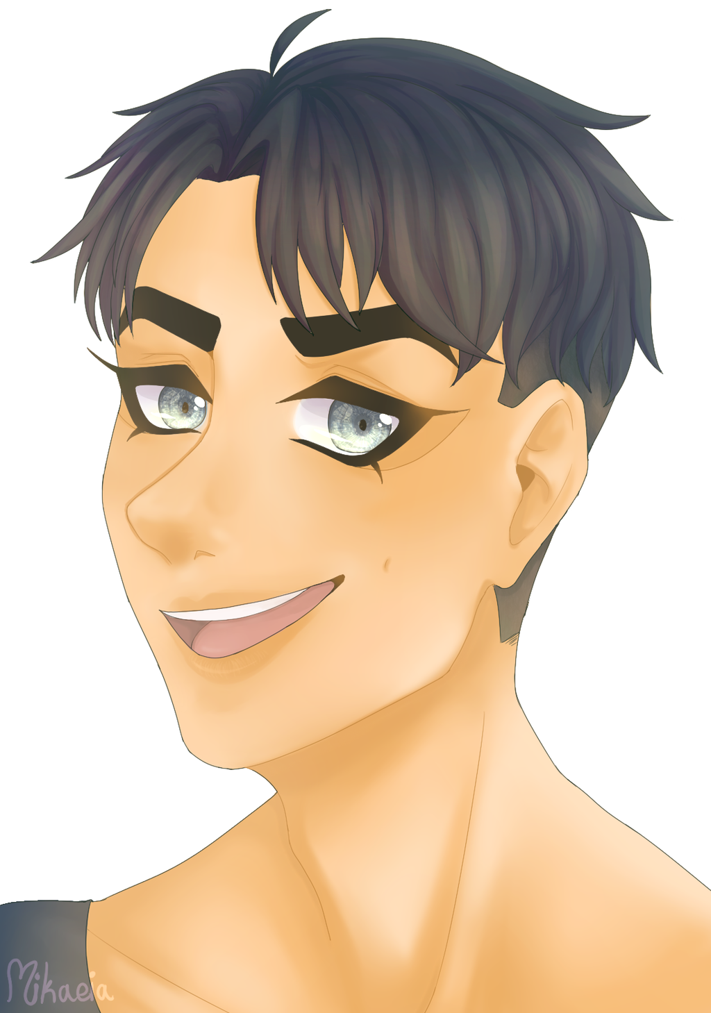 Description: A drawing of a man with a smirk on his face and a black hair and blue eyes and a black shirt.