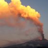 Description: A large plume of smoke is seen from a distance as it rises into the sky above a mountain range.