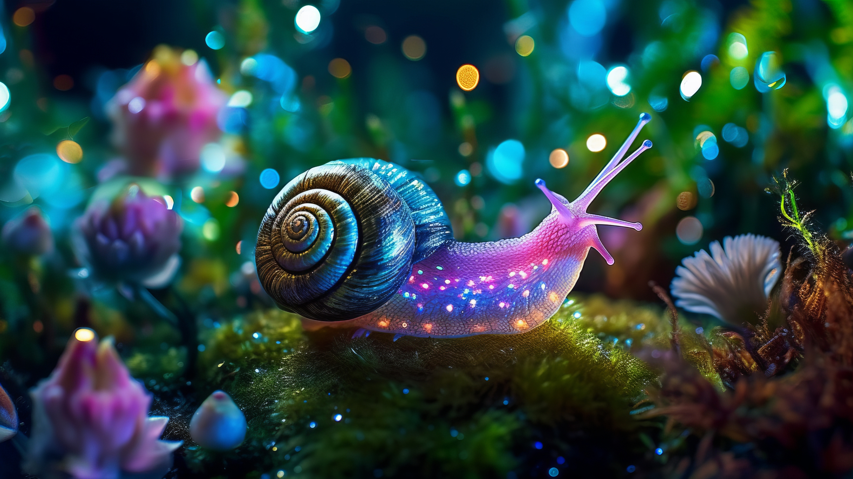 Description: A snail is sitting on a mossy surface with a lot of flowers around it and a blurry background.