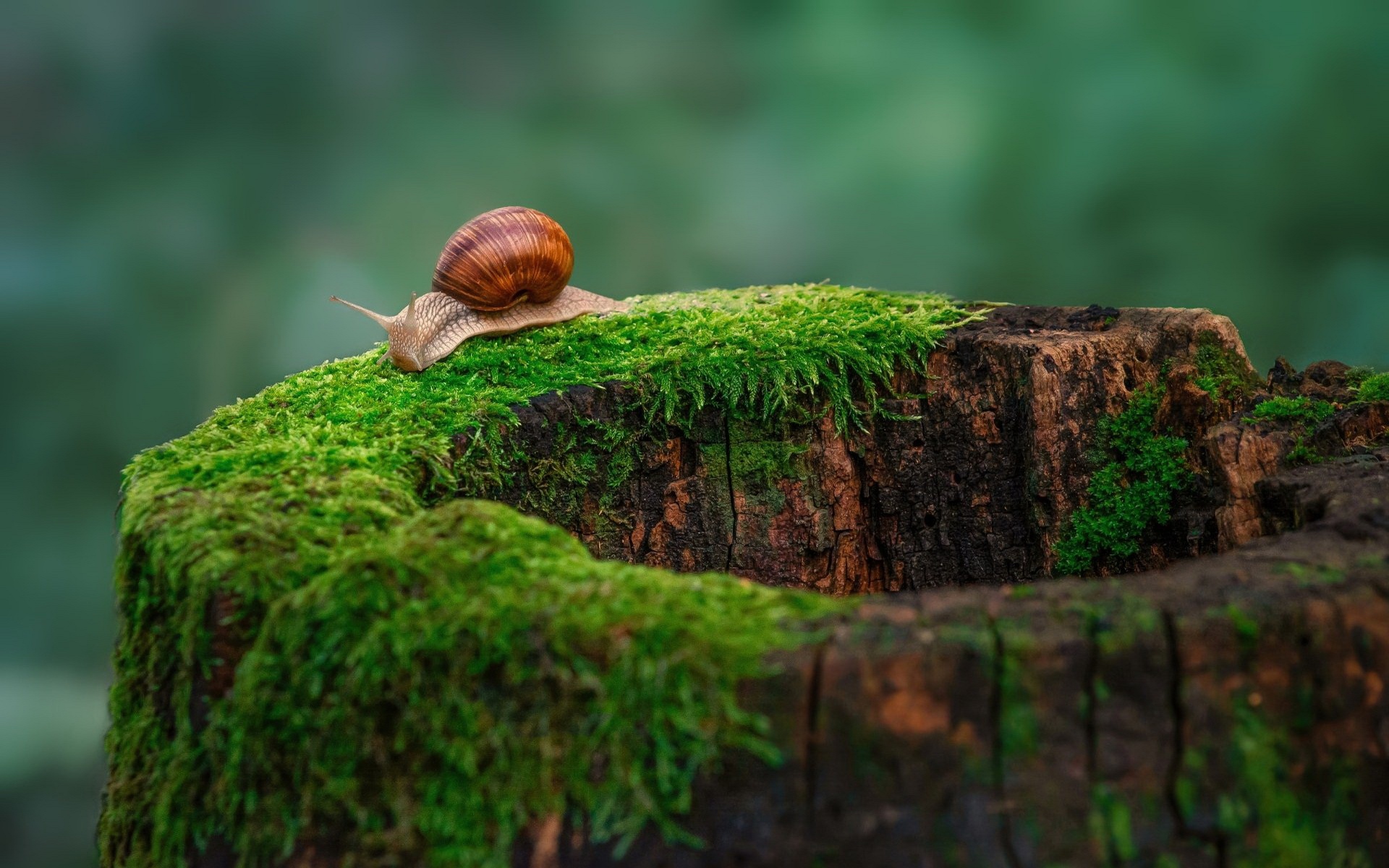Description: A snail is sitting on a mossy log in the forest.