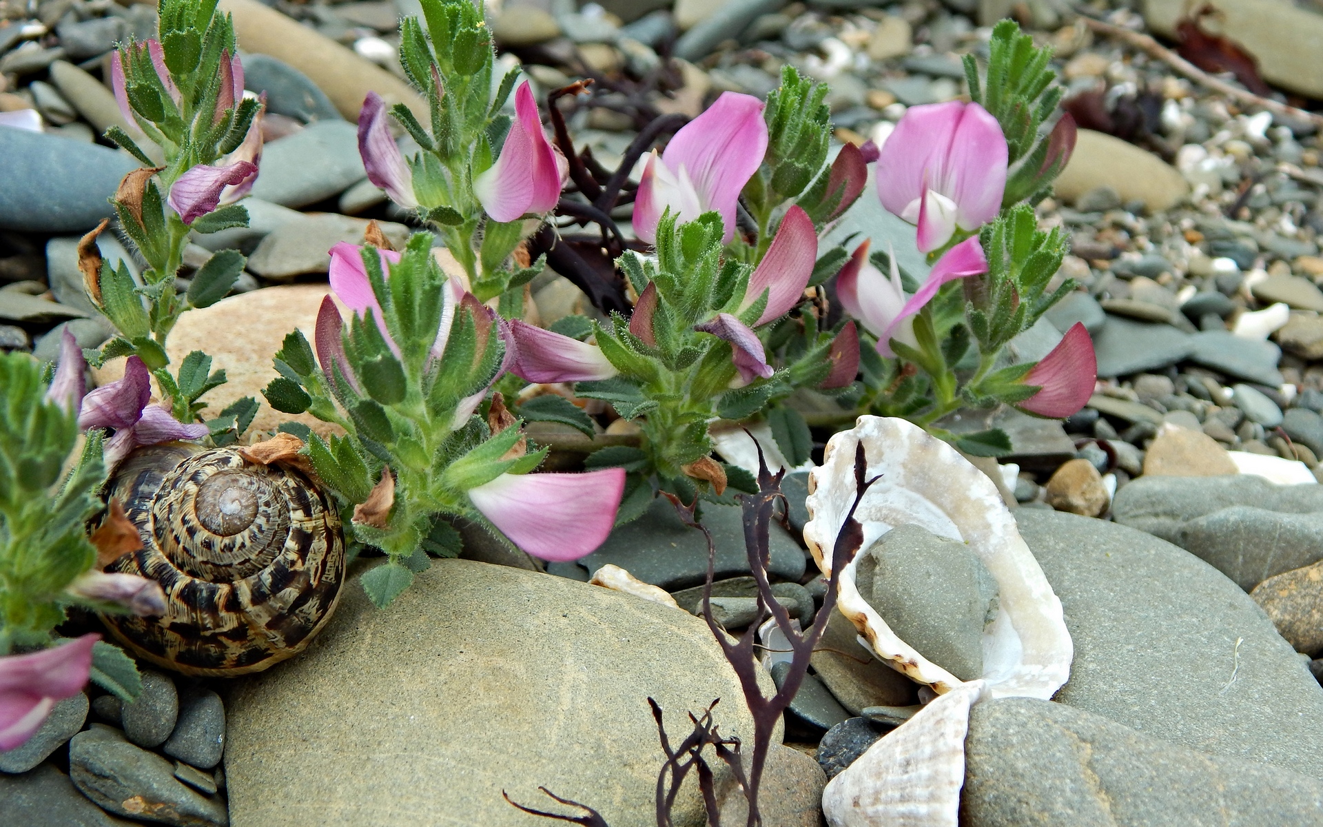 Description: A snail is sitting on a rock near flowers and rocks on the ground with rocks and pebbles around it.