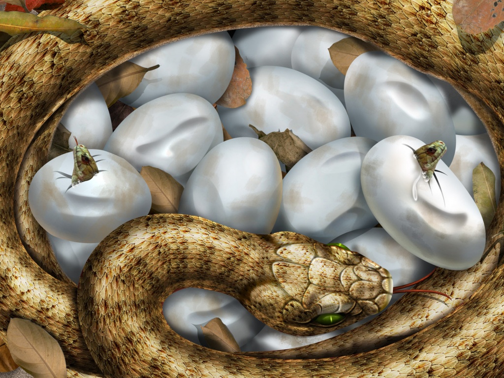 Description: A snake in a basket filled with white eggs and other items in the background.