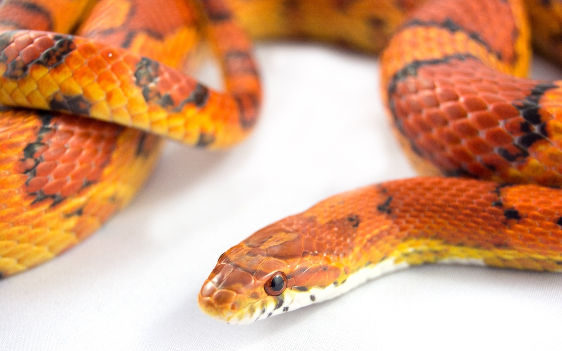 Description: A close up of a snake on a white surface with a white background and a black stripe on the end of the snake.