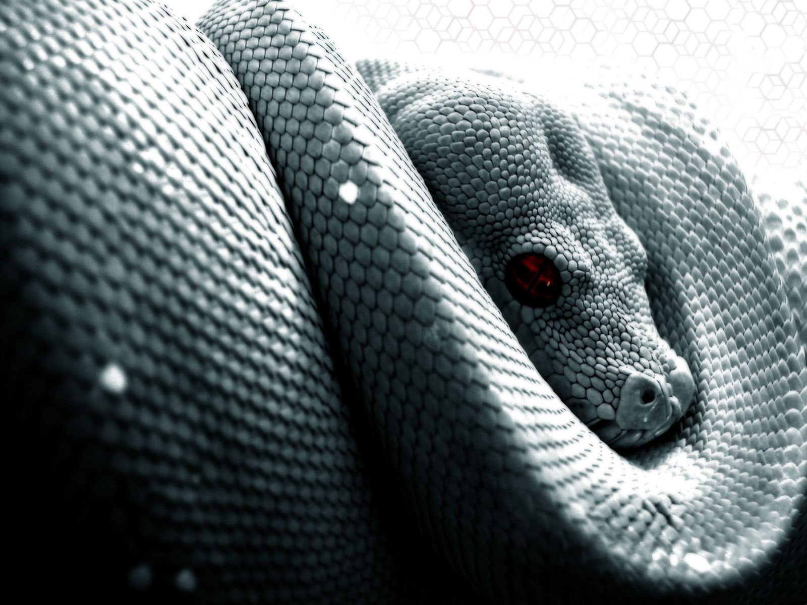Description: A snake wrapped around a pillow with red eyes on it's head and head is shown in the background.