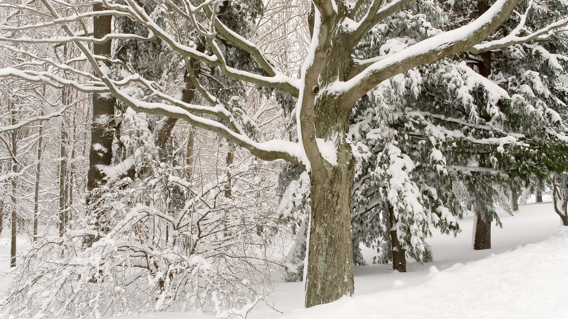 Description: A snow covered forest with a large tree in the foreground and a few snow covered trees in the background.