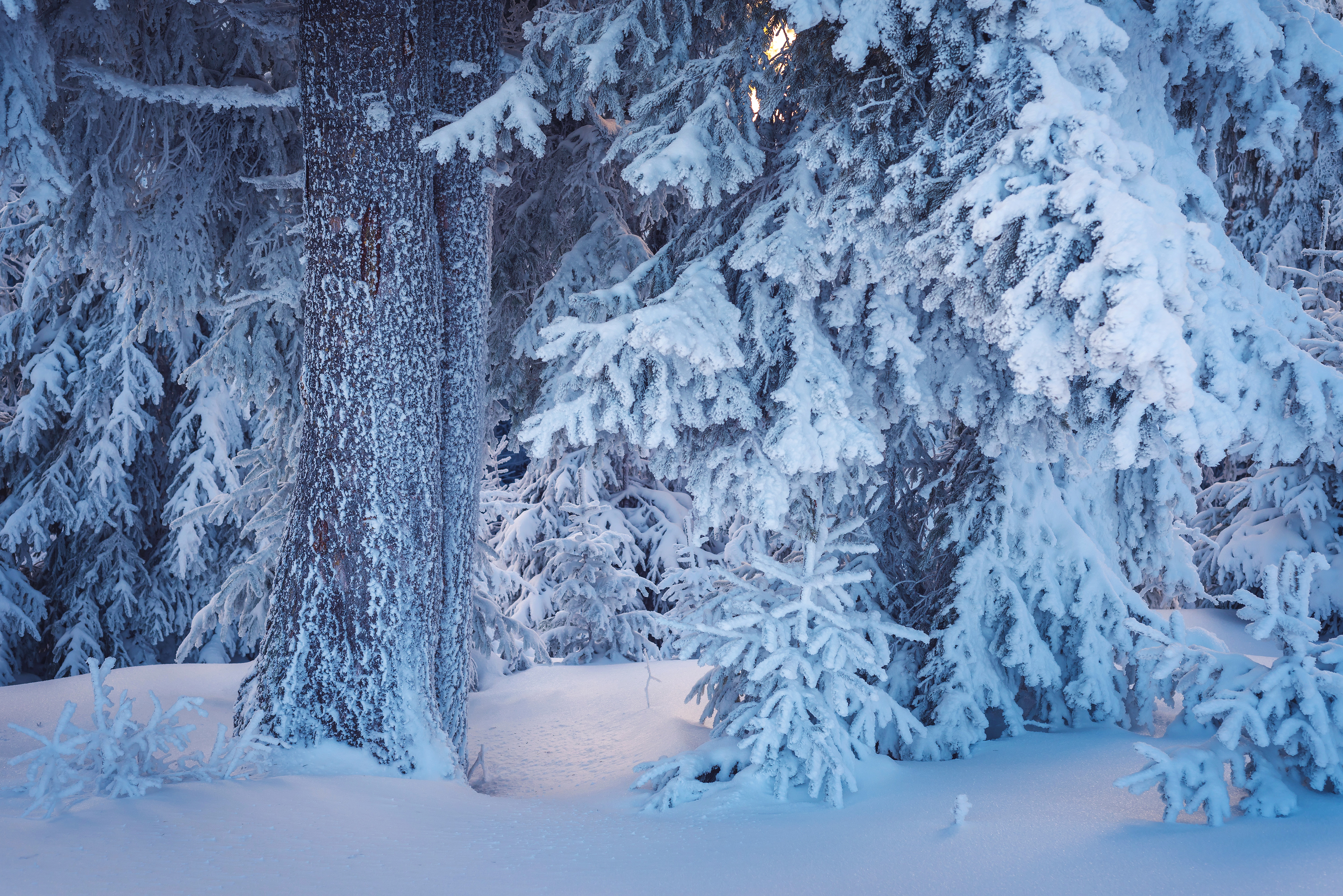 Description: A snow covered forest with a lot of trees in the background and a person on skis in the foreground.
