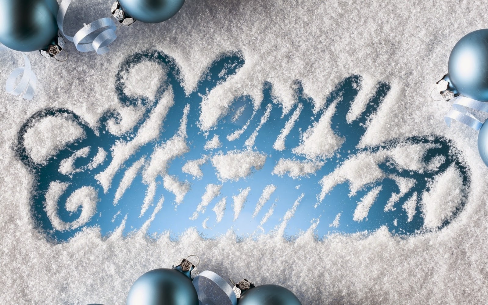 Description: A snow covered ground with ornaments and a blue merry christmas message on it's side and a blue ribbon.