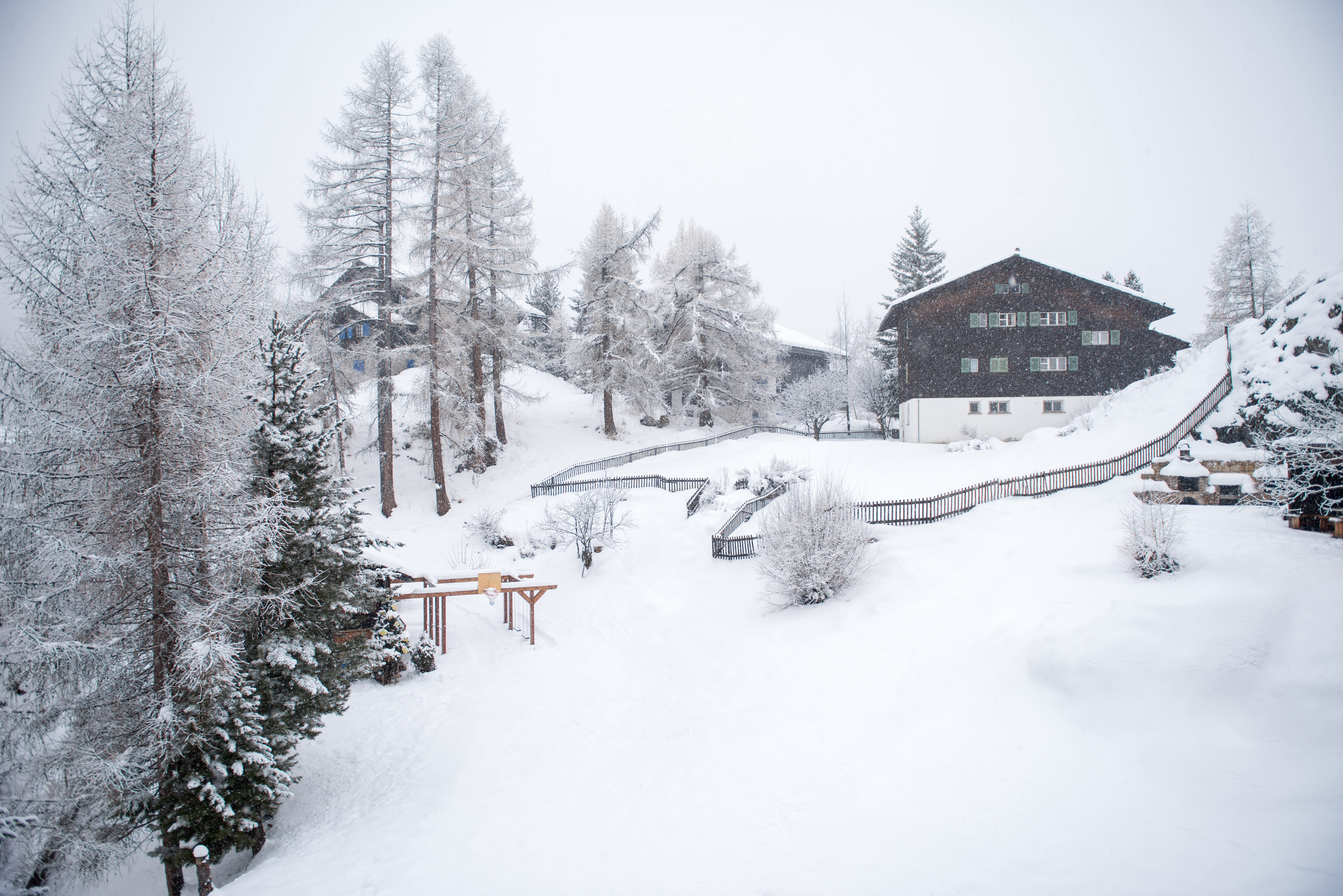 Description: A snow covered hillside with a house and trees in the background and a snow covered path leading to the top of the hill.