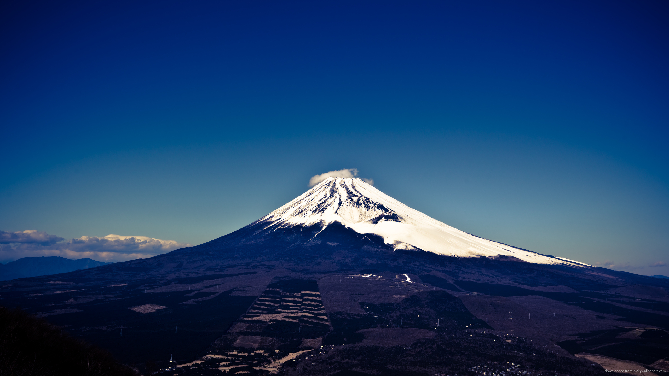 Description: A snow covered mountain with a clear blue sky above it and a few clouds in the sky above it.