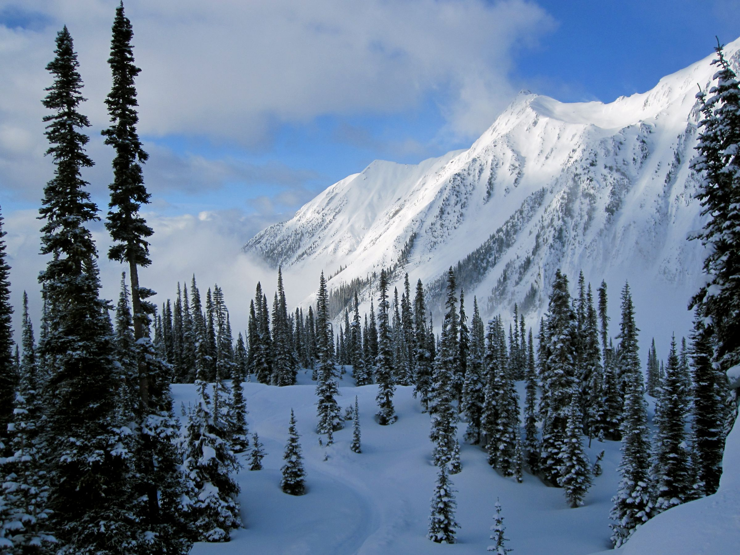 Description: A snow covered mountain with trees and a trail in the foreground and a blue sky with clouds in the background.
